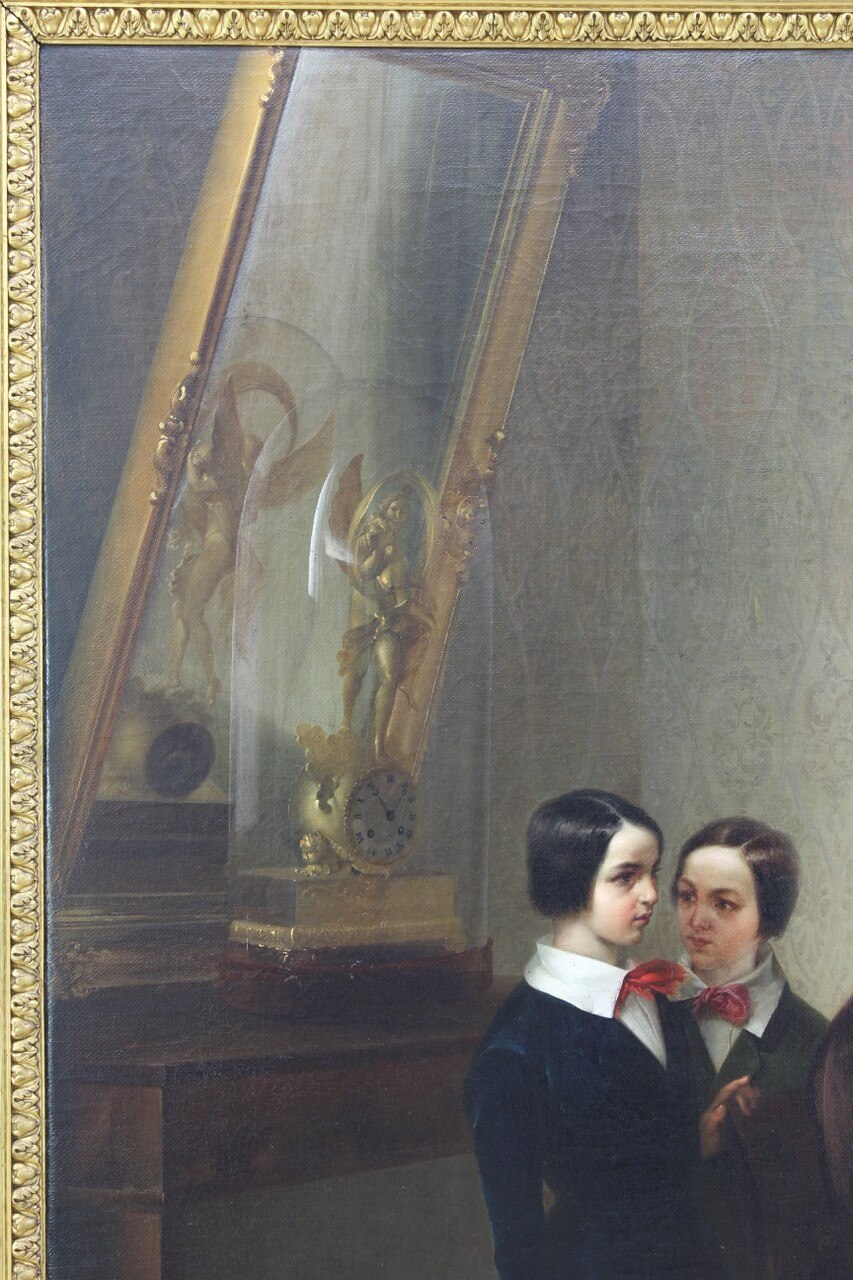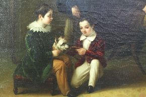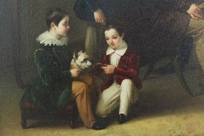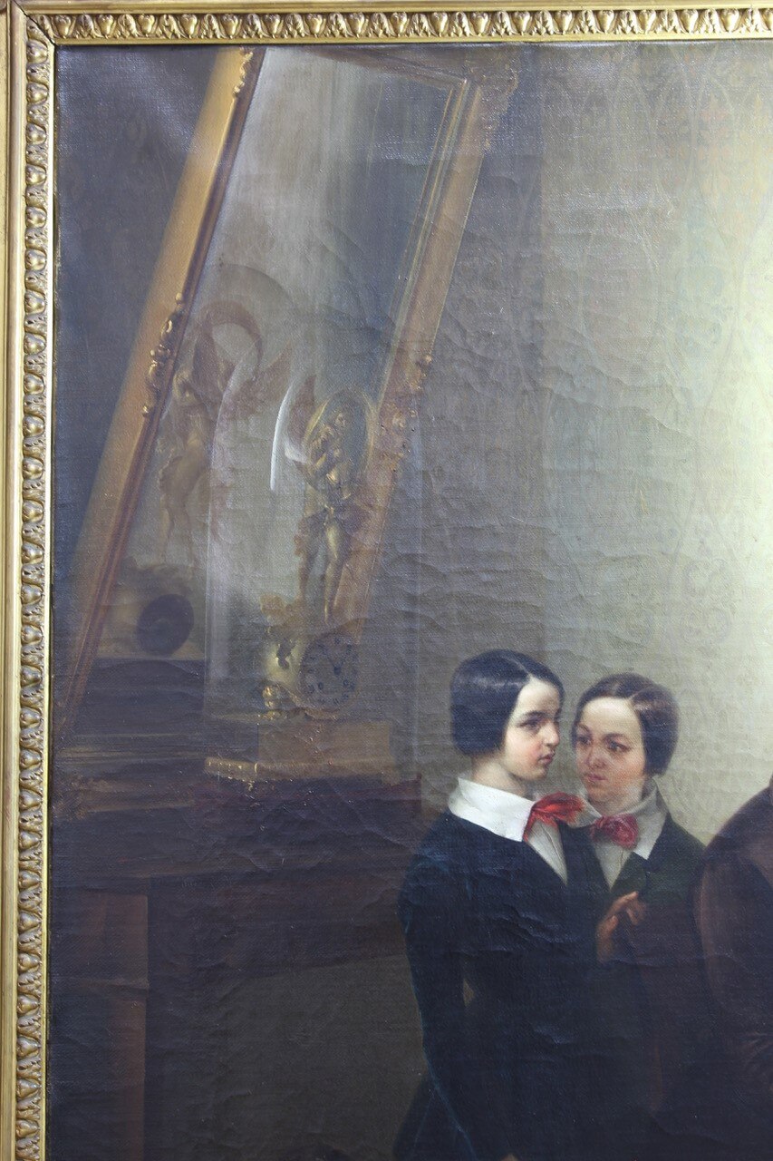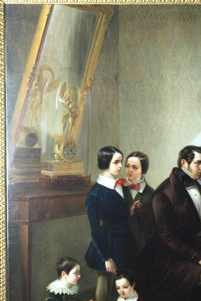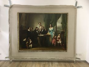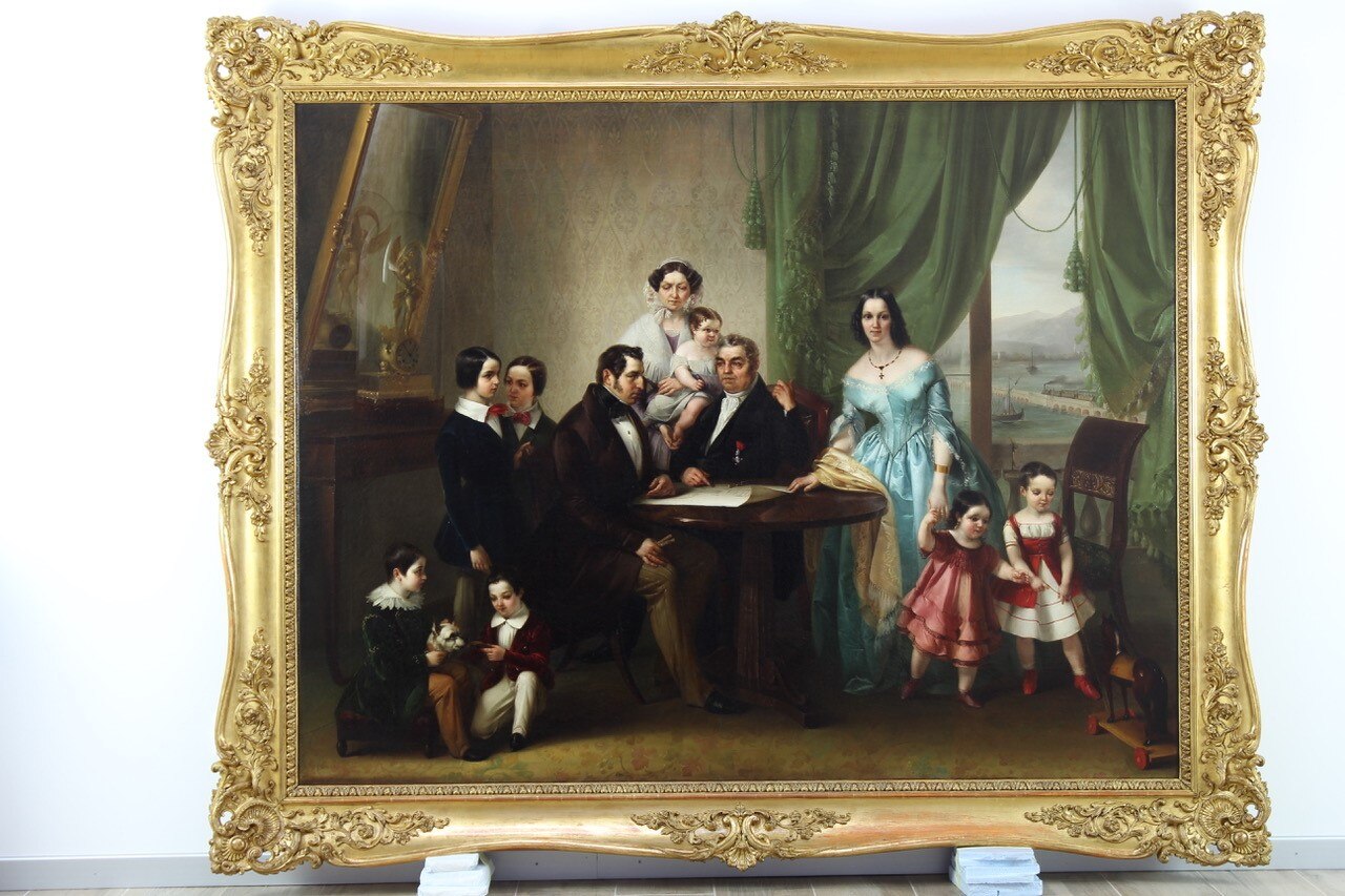 La storia del quadro si intreccia a quella della famiglia dell’impresario Antonio Busetto detto Petich, uno dei protagonisti delle vicende che portarono alla costruzione del ponte ferroviario sulla laguna di Venezia, opera architettonica progettata e realizzata nella prima metà degli anni Quaranta dell’Ottocento. La realizzazione dell’opera del ponte ferroviario fu, per quell’epoca, un’impresa davvero eccezionale, richiedendo l’impiego di enormi risorse economiche, materiali e umane. Buona parte dei meriti per l’esito positivo dei lavori fu riconosciuta all’appaltatore Busetto Petich che, per celebrare degnamente la conclusione dell’operazione, decise di commissionare all’Accademia di Belle Arti di Venezia un grande ritratto della sua famiglia che celebrasse e conservasse memoria dell’avvenimento. L’incarico fu affidato per 11.000 fiorini, forse nel 1843 o nel 1844, a Michelangelo Grigoletti che lo portò a compimento in tempi piuttosto ristretti, considerando che il grande dipinto figurava ormai terminato all’esposizione accademica tenutasi a Venezia nell’agosto del 1845.