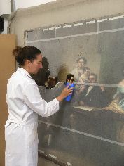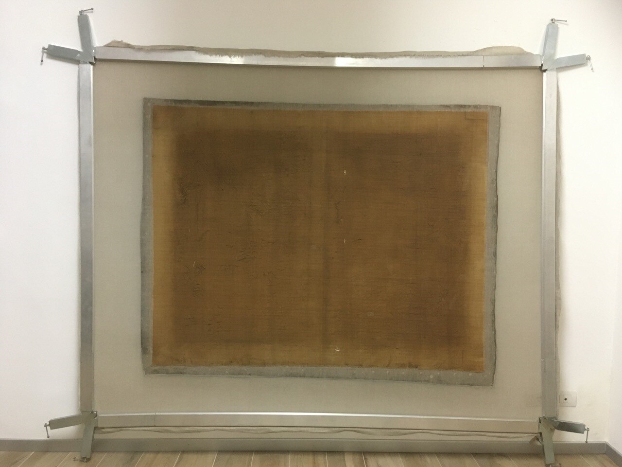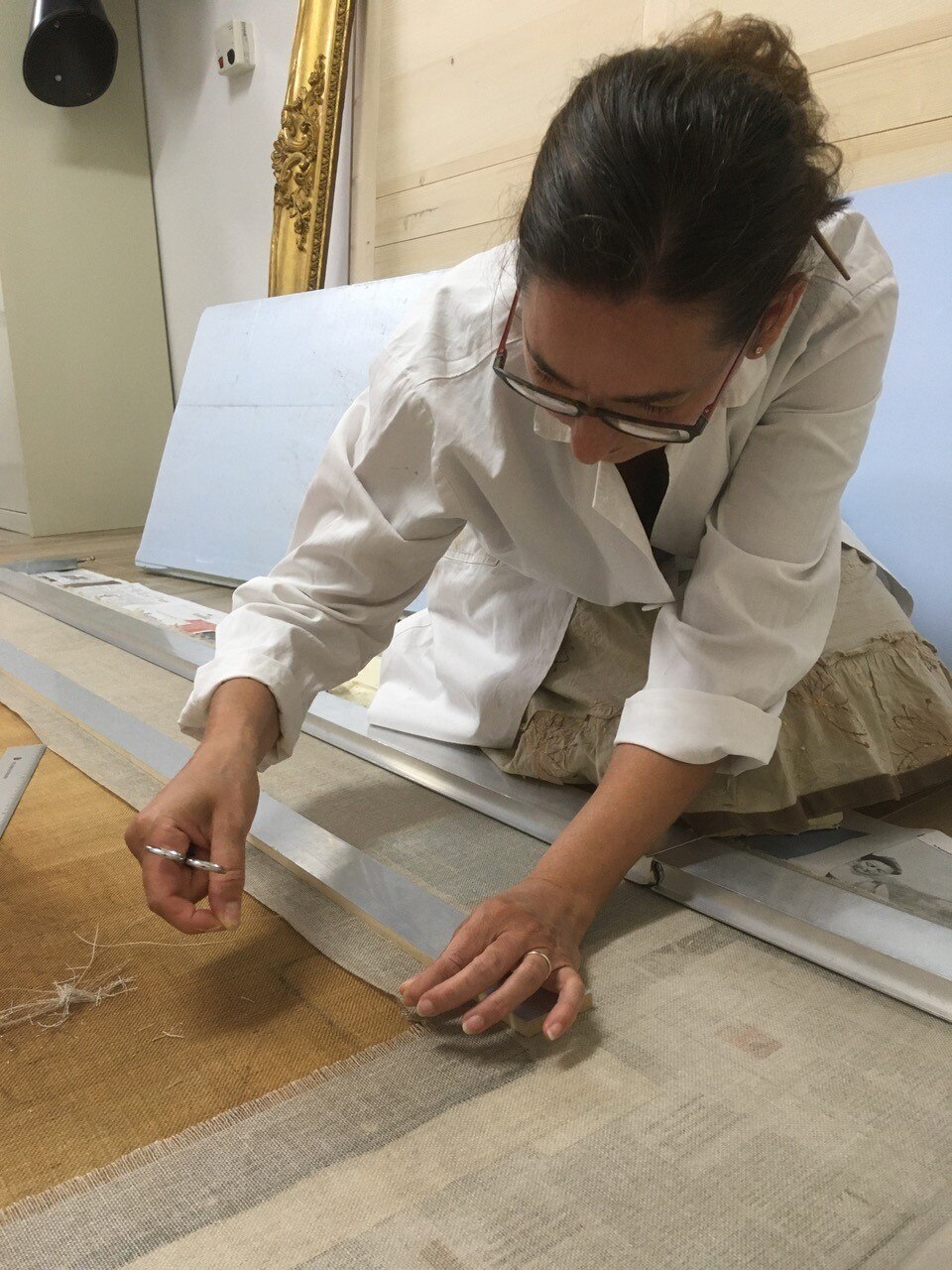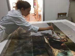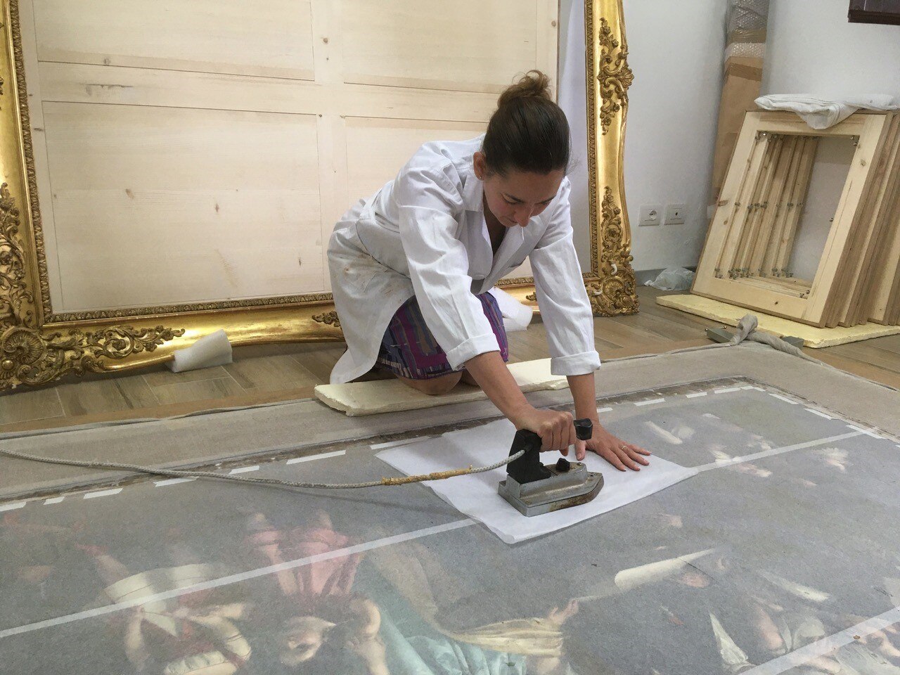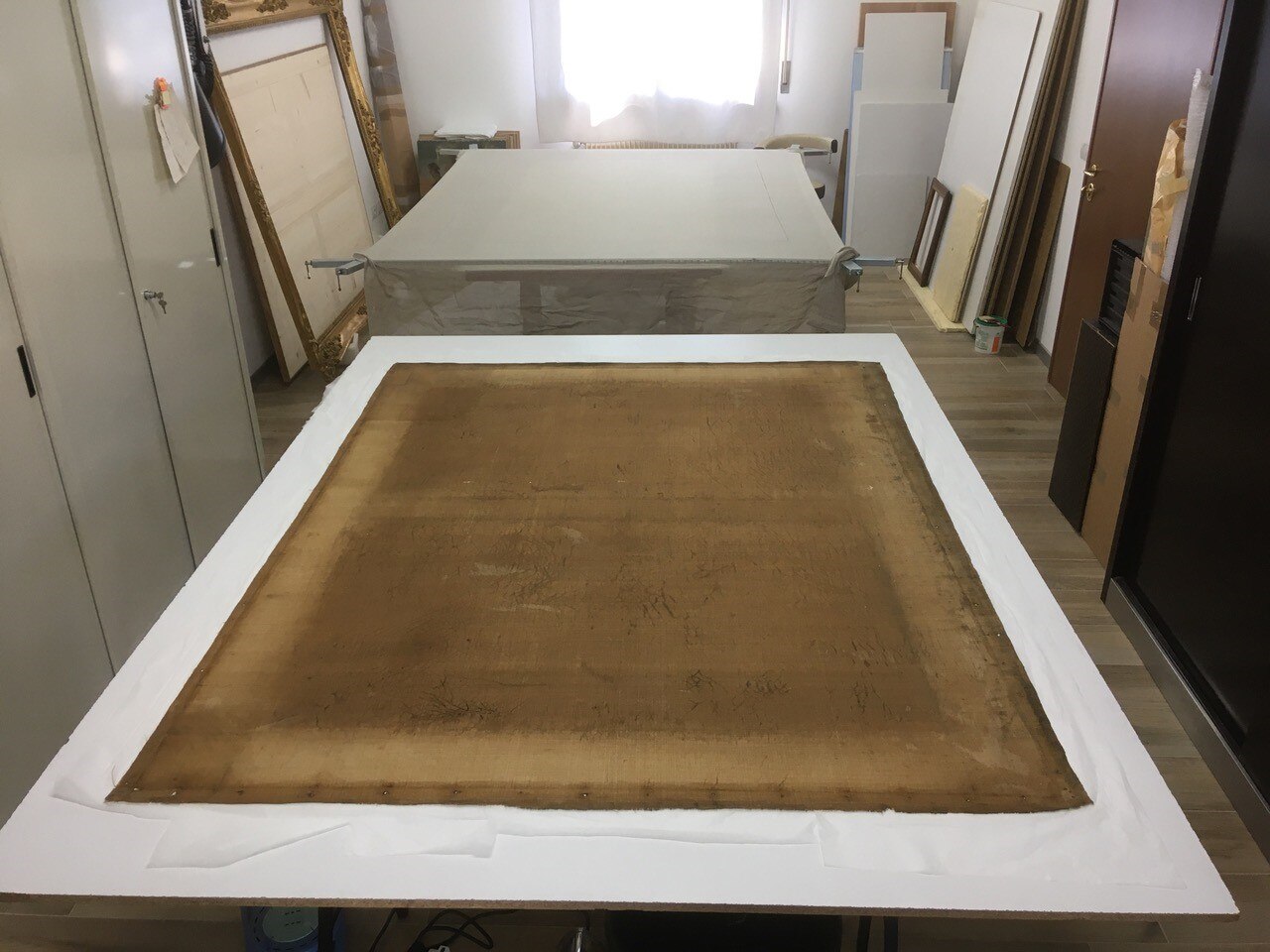Verso il gran finale. Ecco alcune immagini delle ultime attività: fissaggio del colore, svelinatura, tensionatura sul nuovo telaio armonico, doratura delle parti mancati della cornice.
