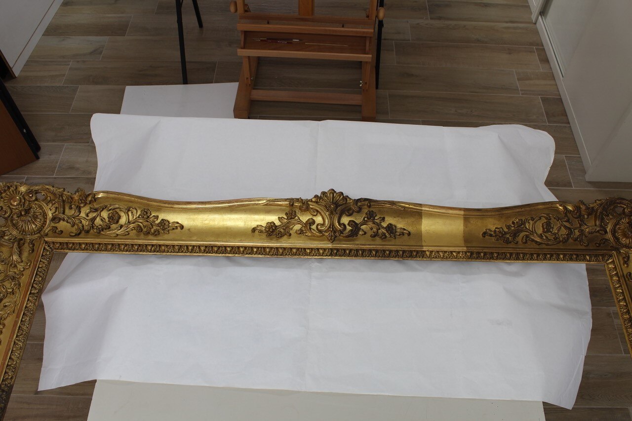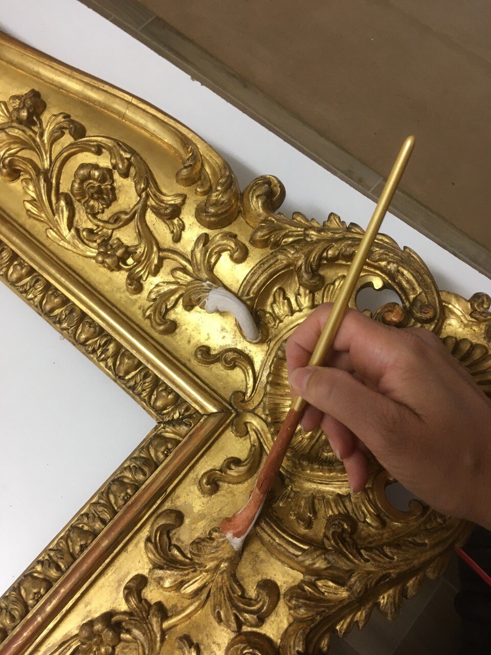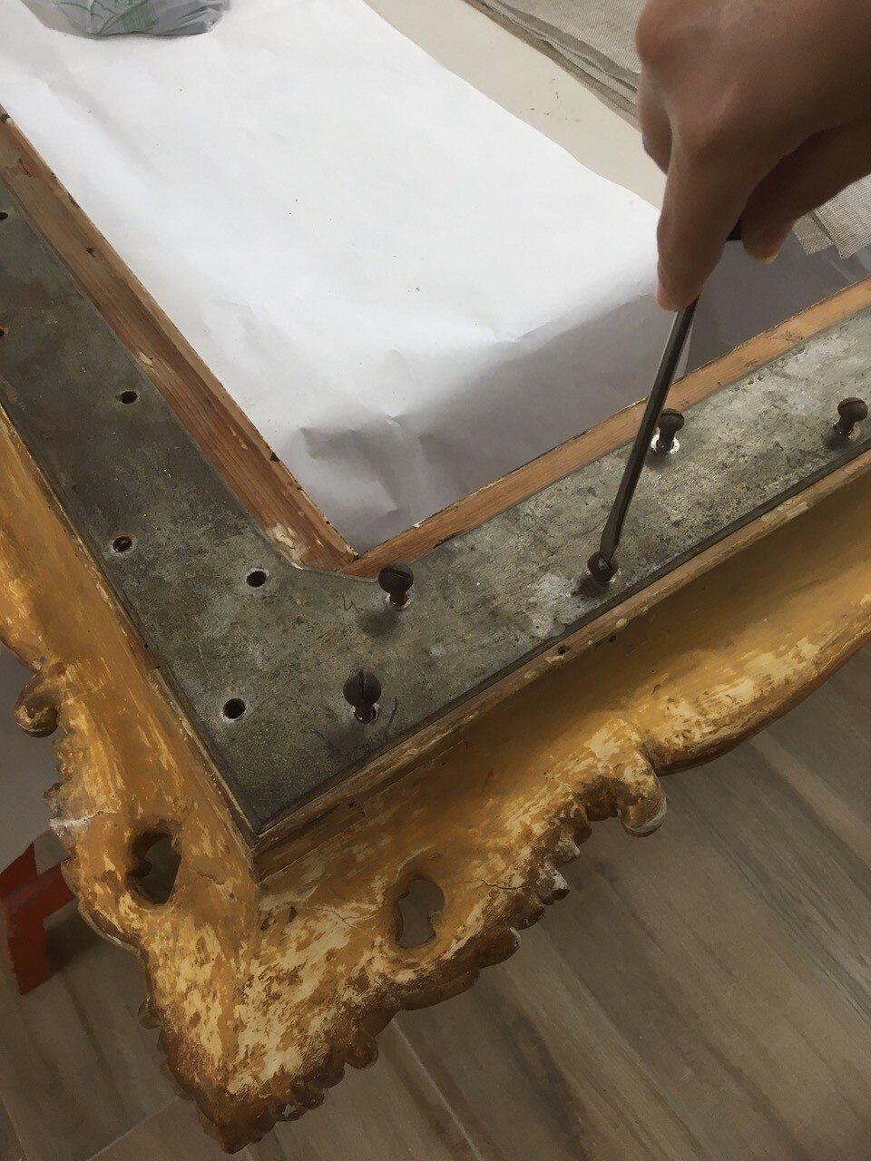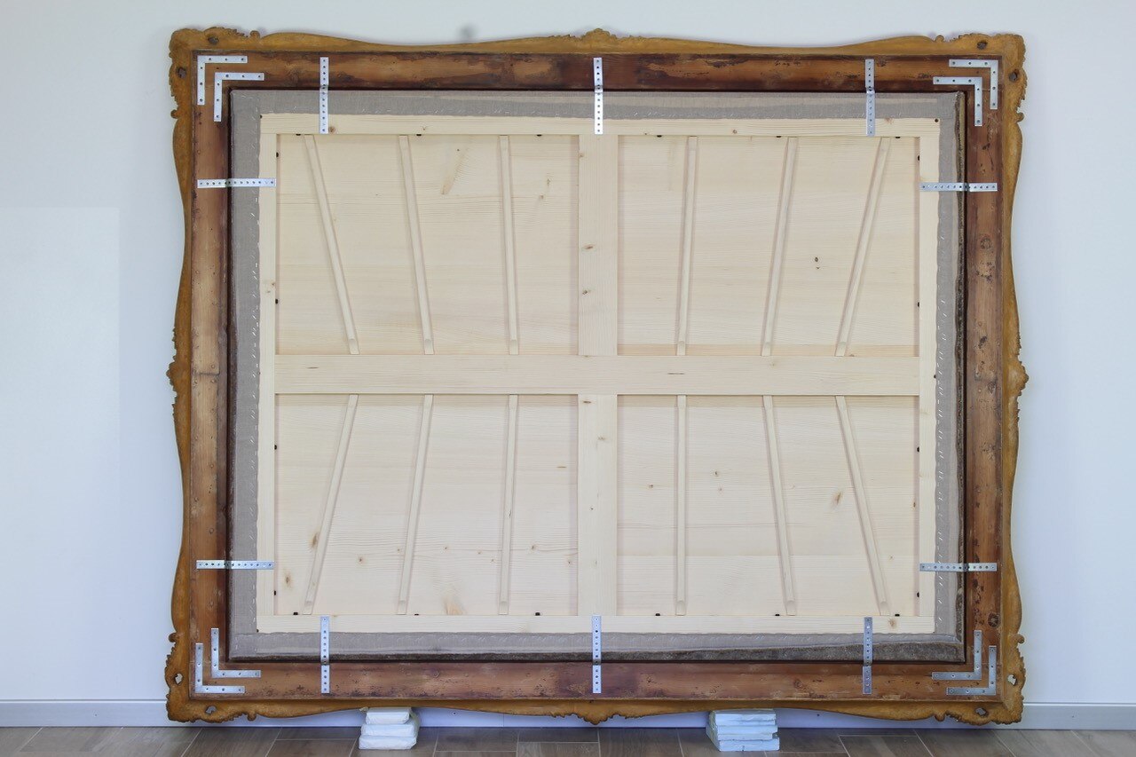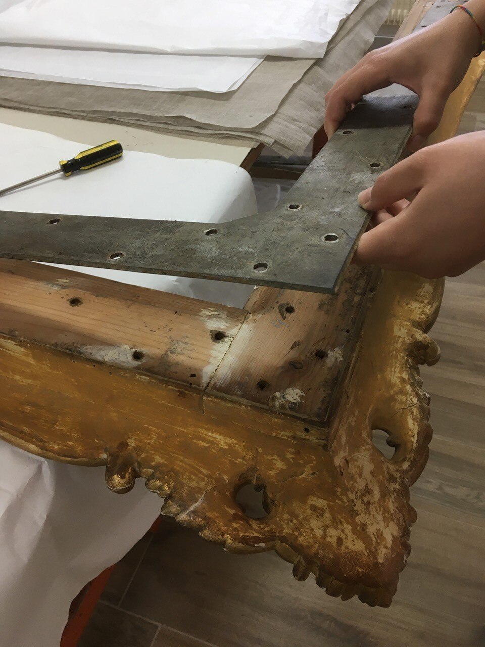 Questione di...cornice! Ecco le immagini dell’intervento sulla cornice, mentre la tela è in fase di tensionatura. Le fasi descritte sono quelle dell'applicazione del prodotto antitarlo, della pulitura, della stuccatura, e infine del rifacimento delle parti mancanti.