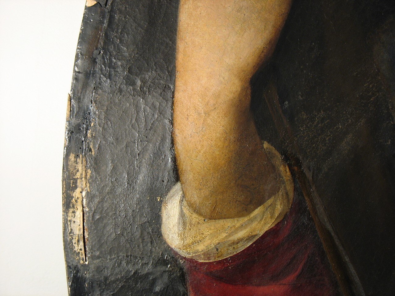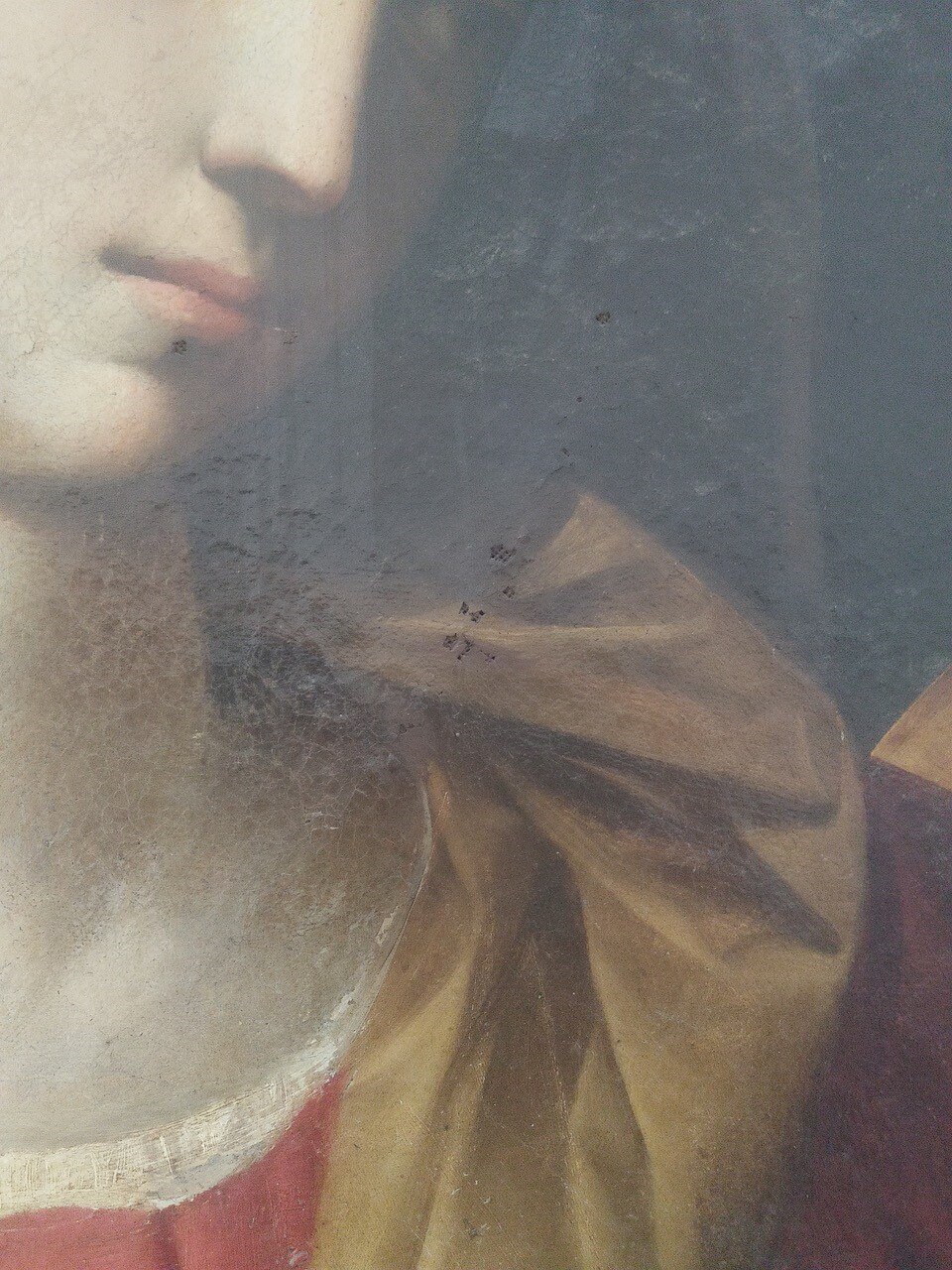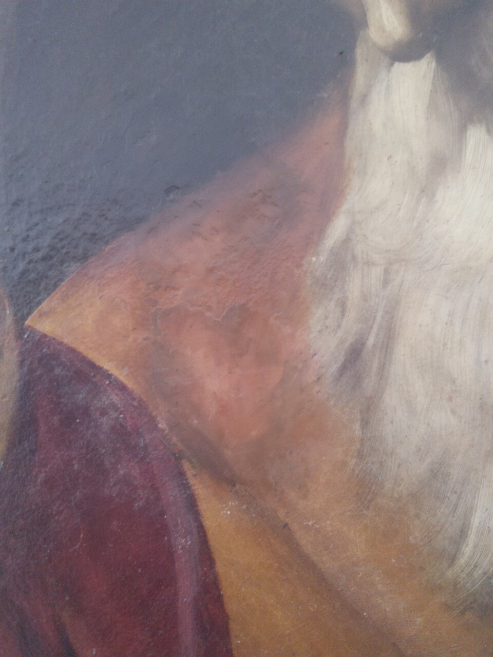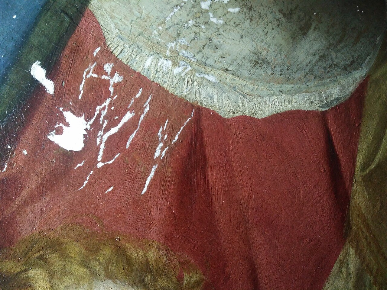 La pulitura. Le foto si riferiscono ad alcuni particolari della pulitura e all’eliminazione delle precedenti stuccature, sia sull’opera che sulla cornice.