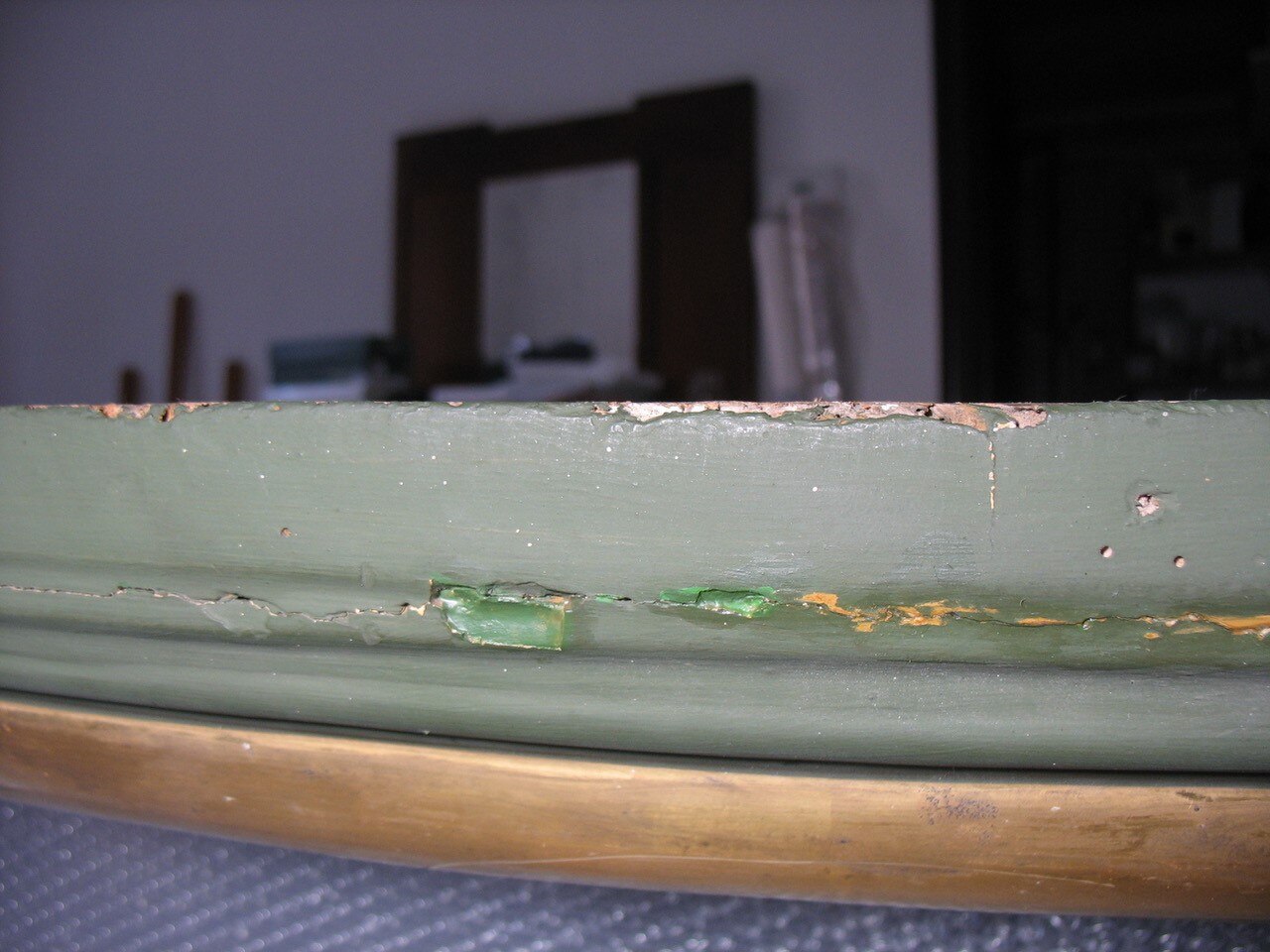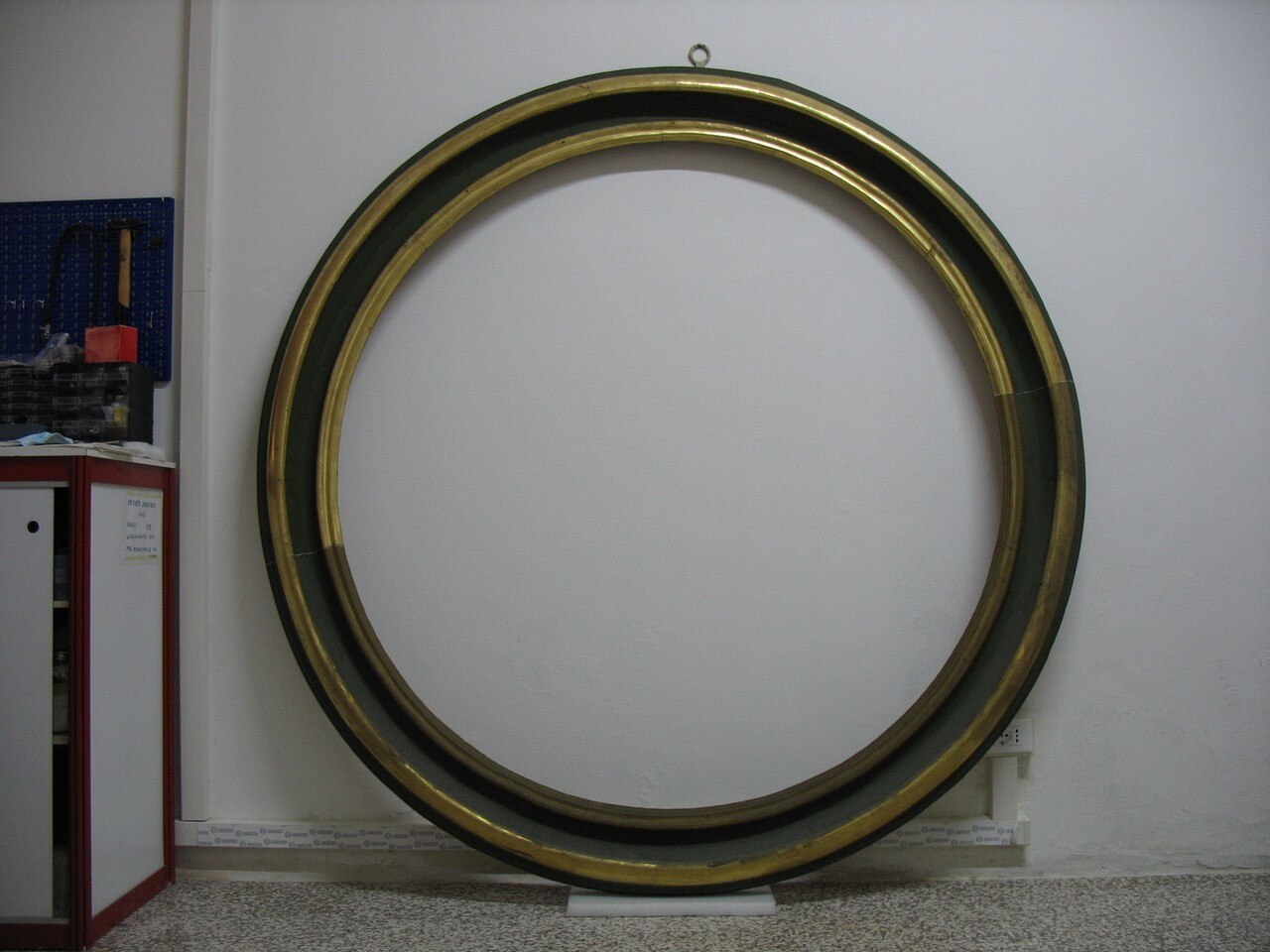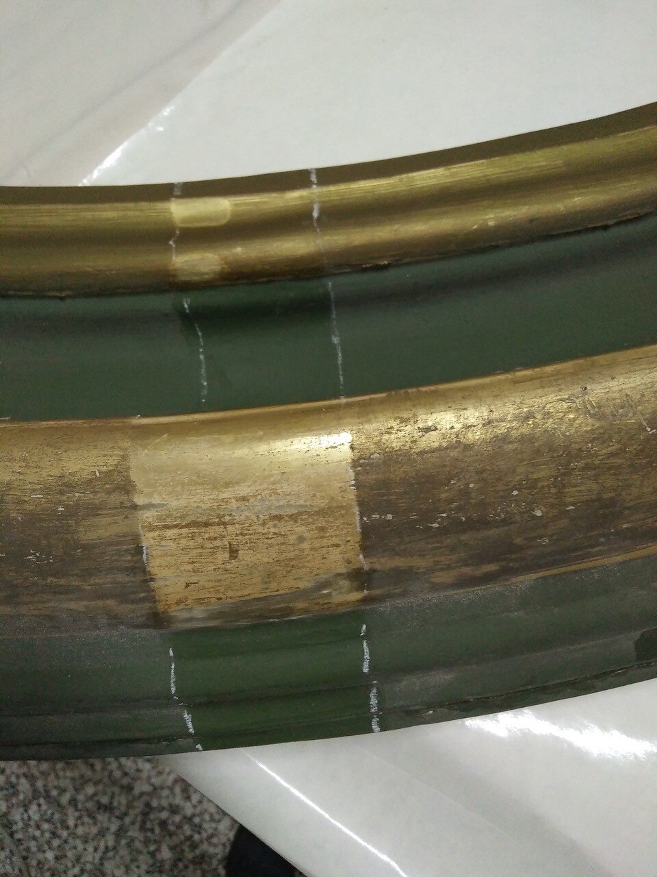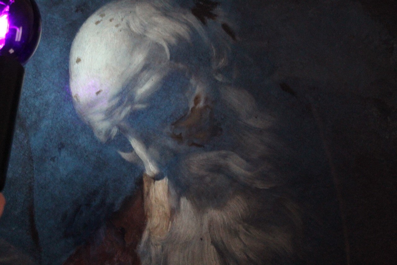 La cornice. Le foto si riferiscono alle attività di pulizia della cornice, con evidenziazione dei distacchi e delle lacune, e della prove di ridipintura con lampada di Wood.