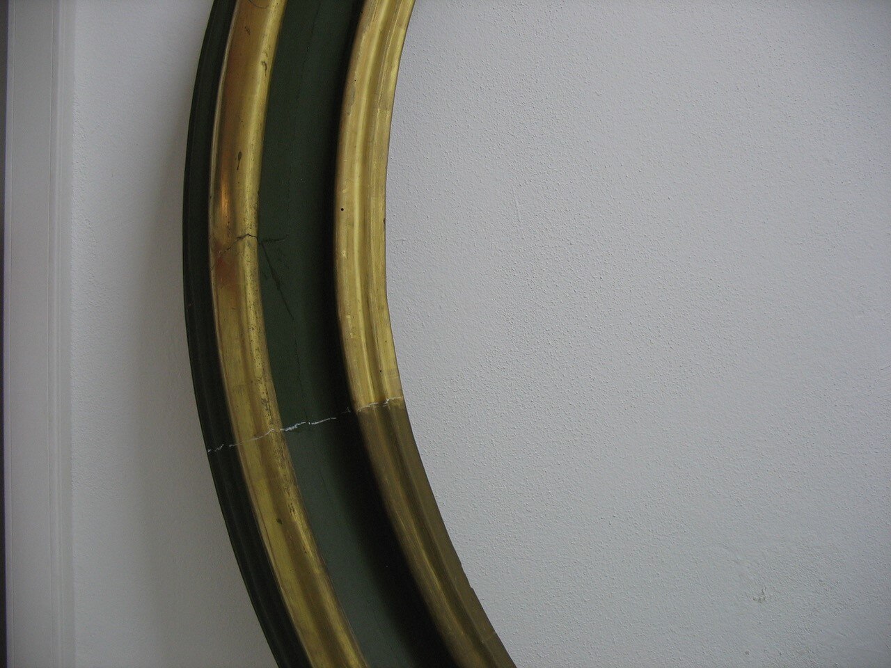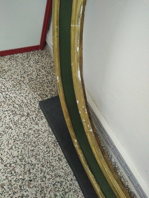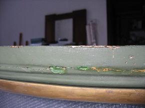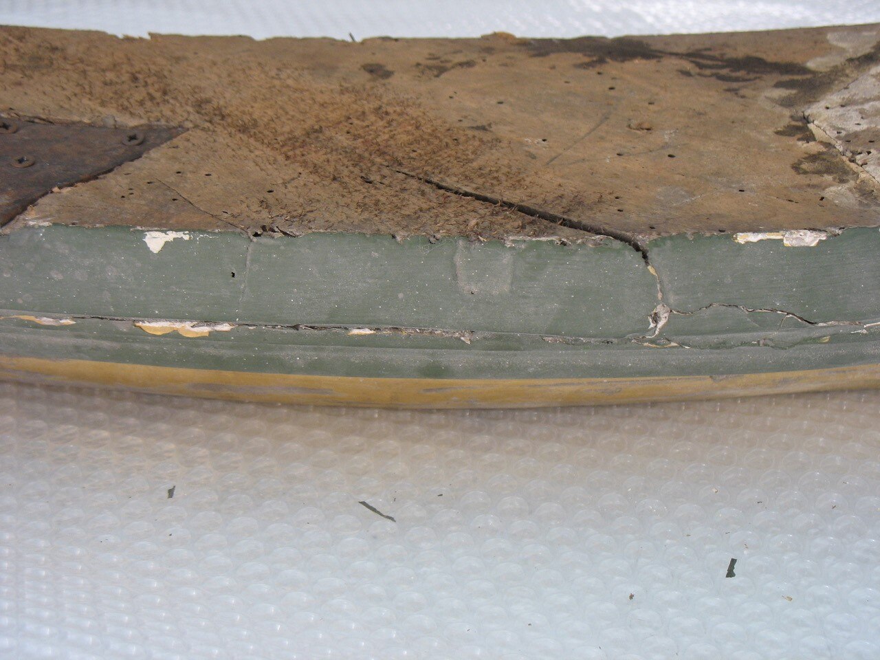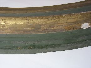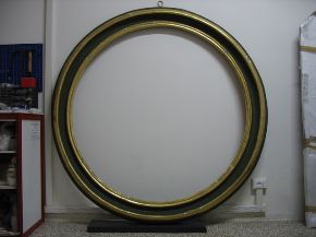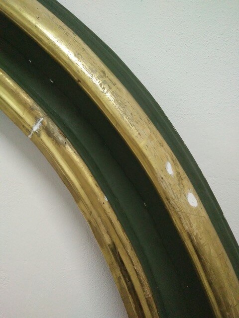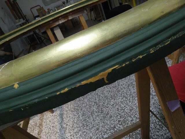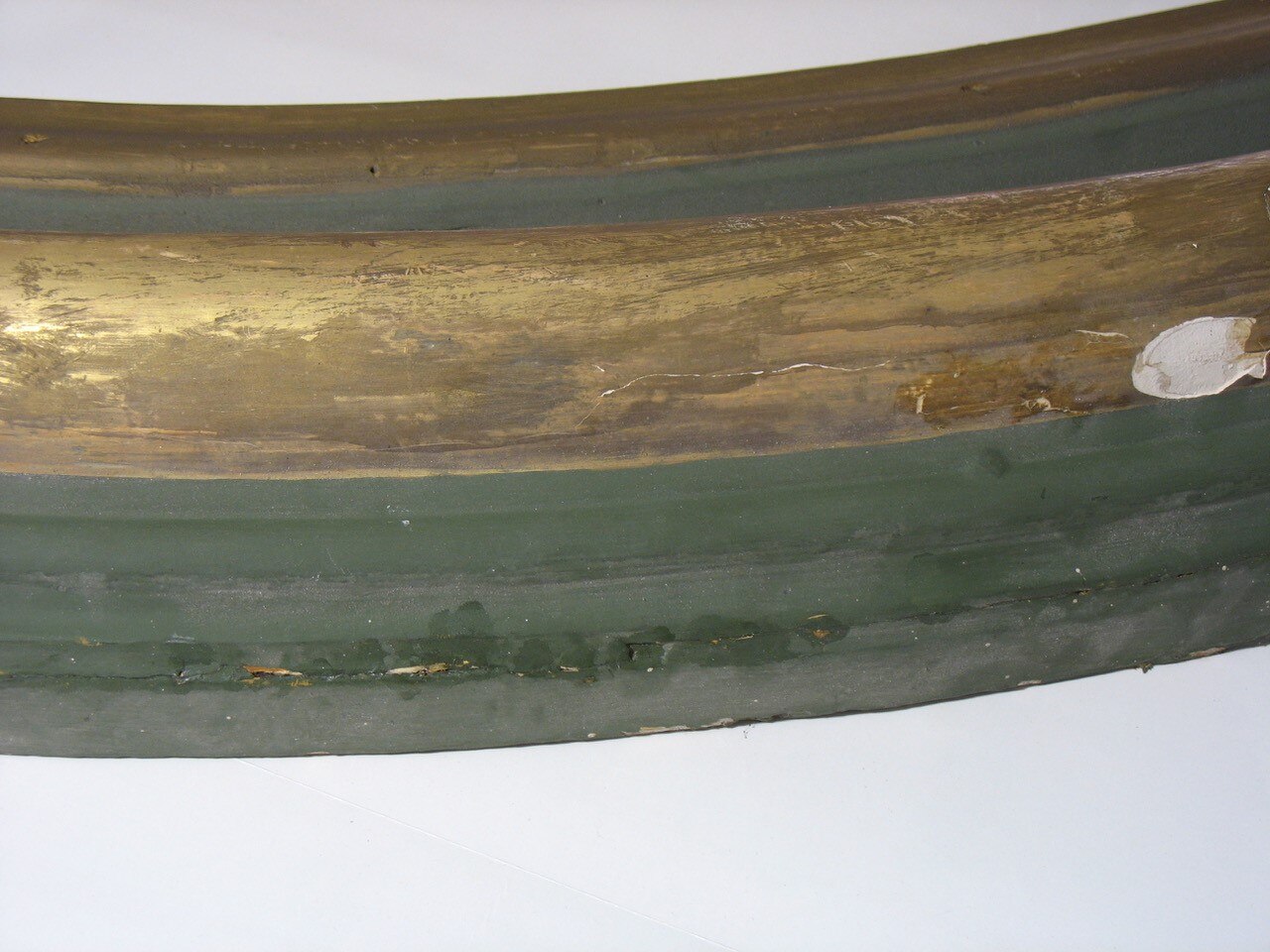 La cornice. Le foto si riferiscono alle attività di pulizia della cornice, con evidenziazione dei distacchi e delle lacune, e della prove di ridipintura con lampada di Wood.