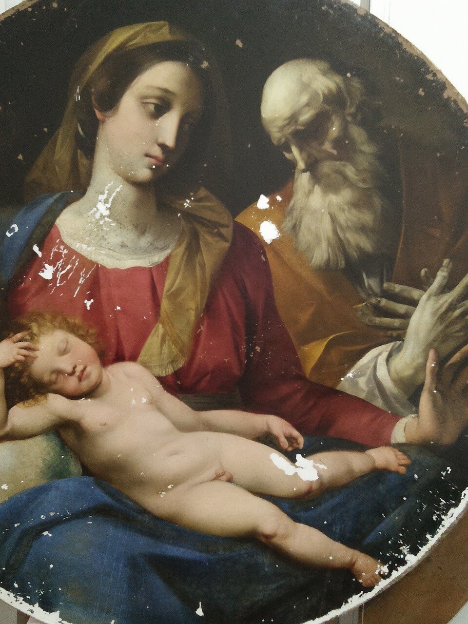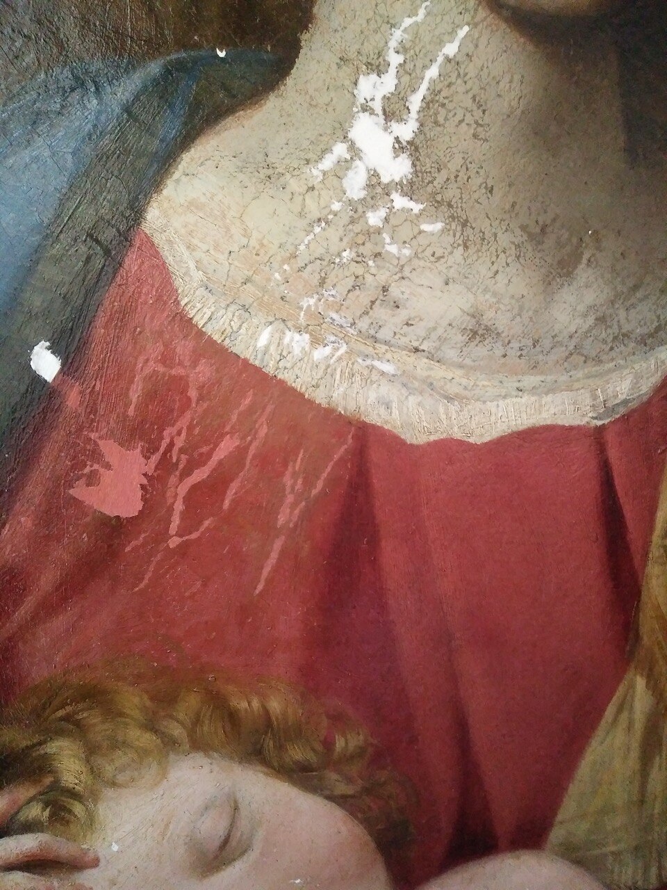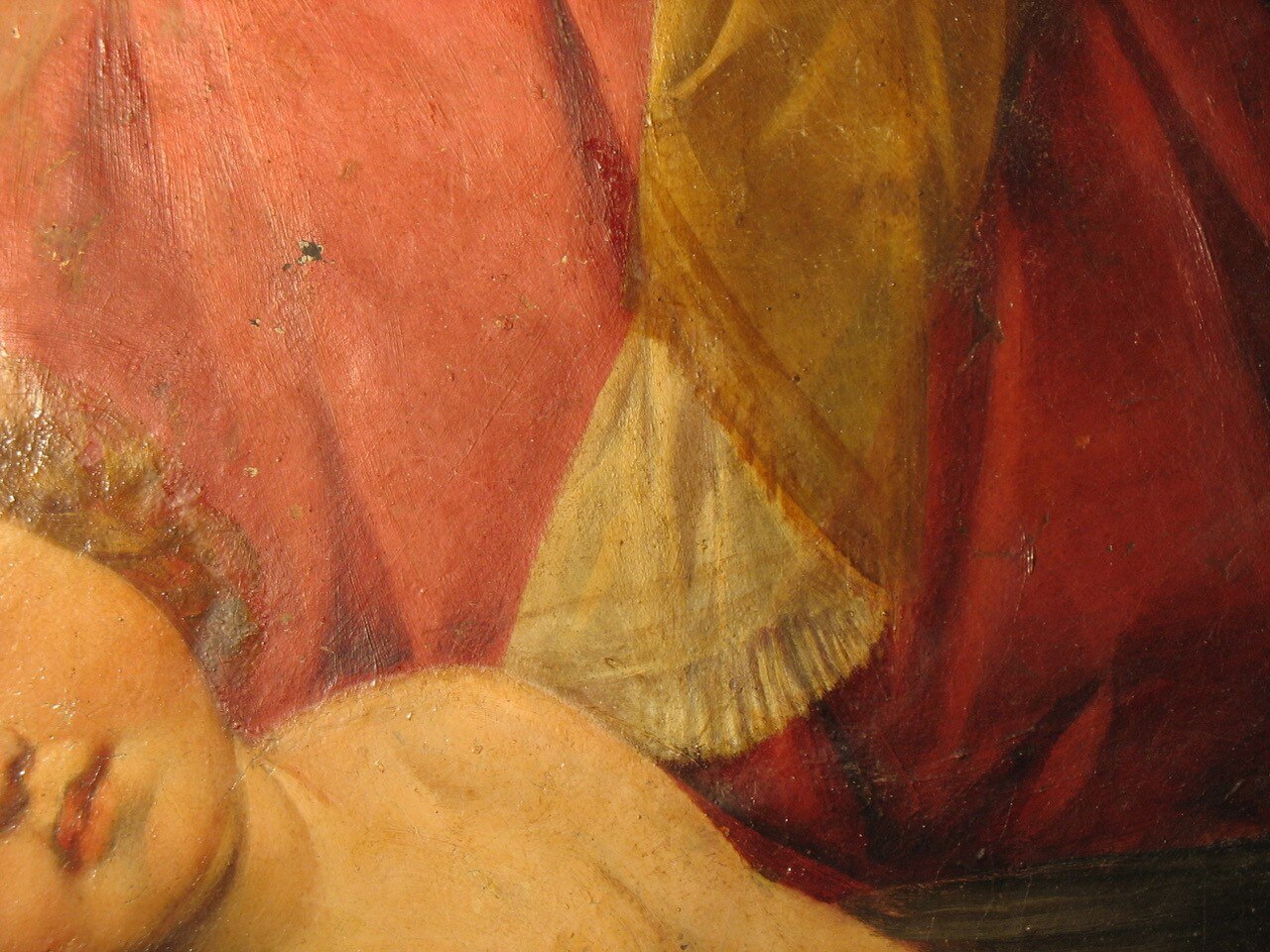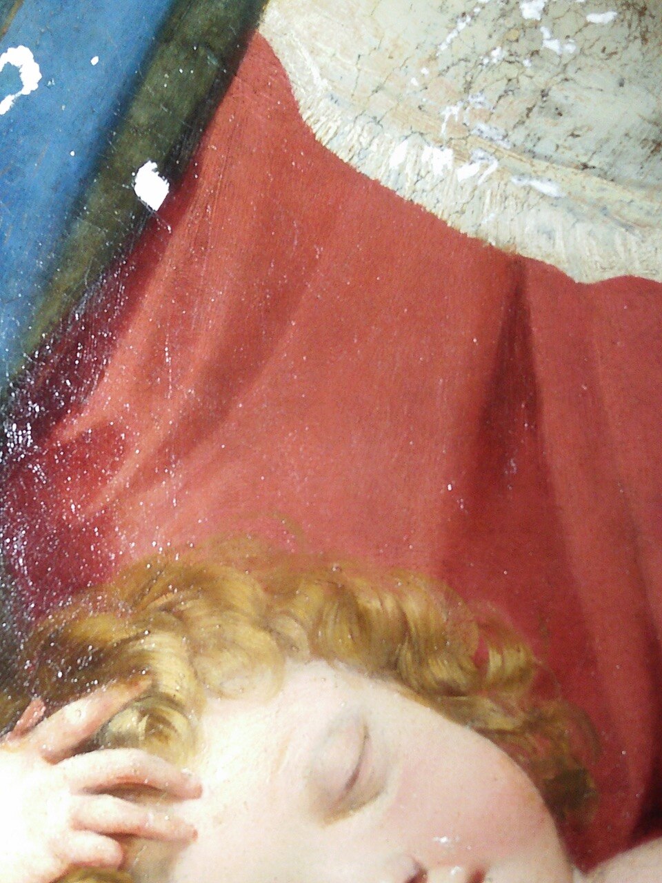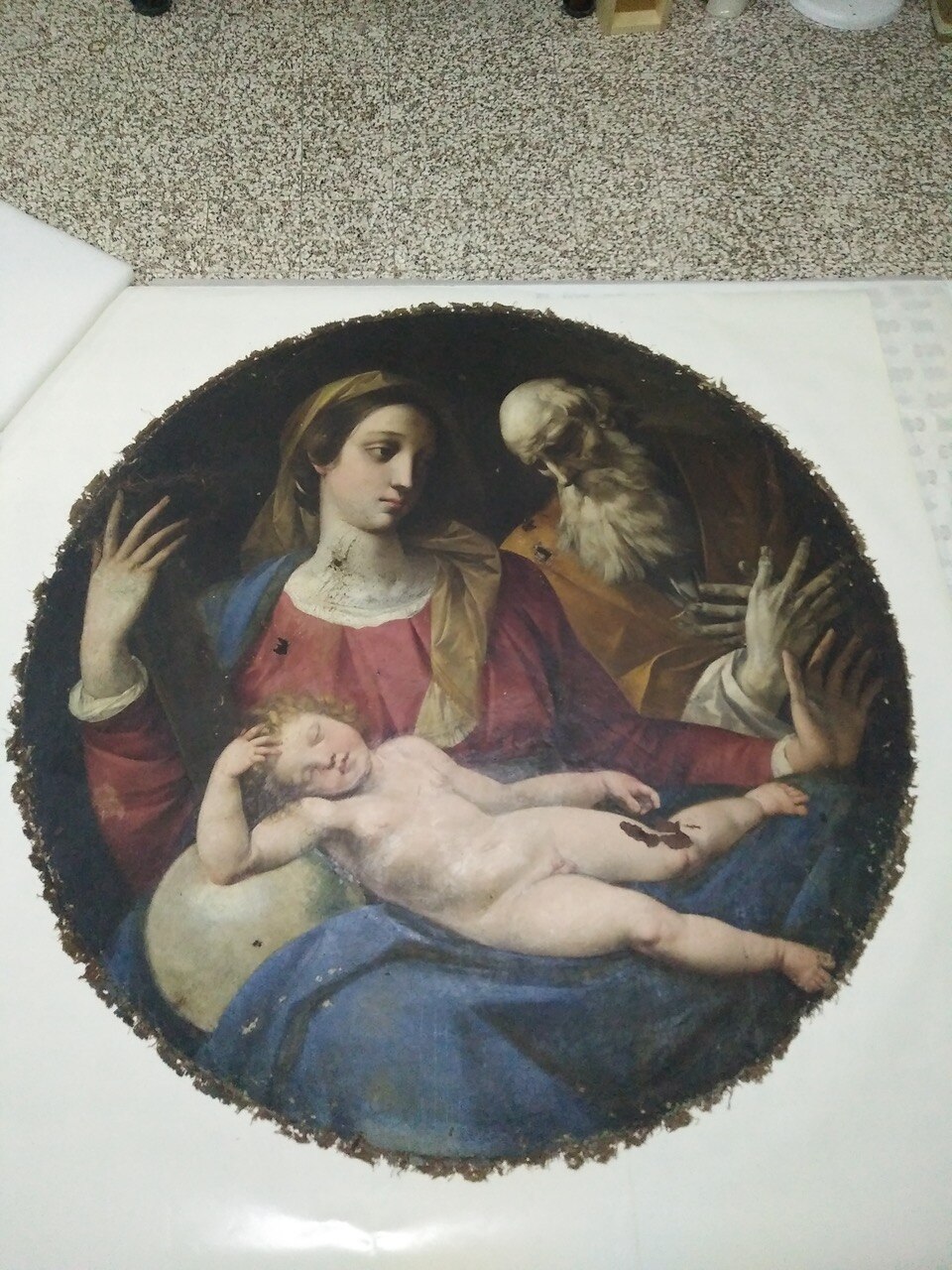Il restauro al via. Le foto si riferiscono alle attività di studio delle problematiche, a luce radente di un particolare con deformazione della mano della Vergine; a luce visibile di uno con ridipinture (veste San Giuseppe) e di uno con ridipintura (gamba del Bambino), ed infine di un particolare con piccole lacune e ossidazione della vernice. L’intervento viene realizzato dalla restauratrice Sonia Radicchi.