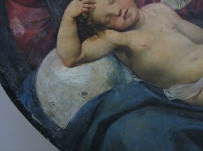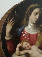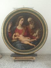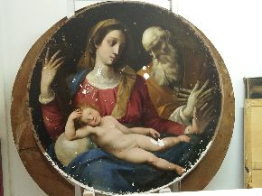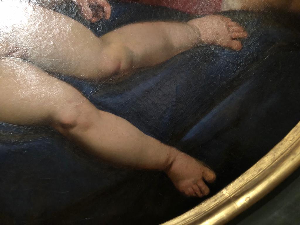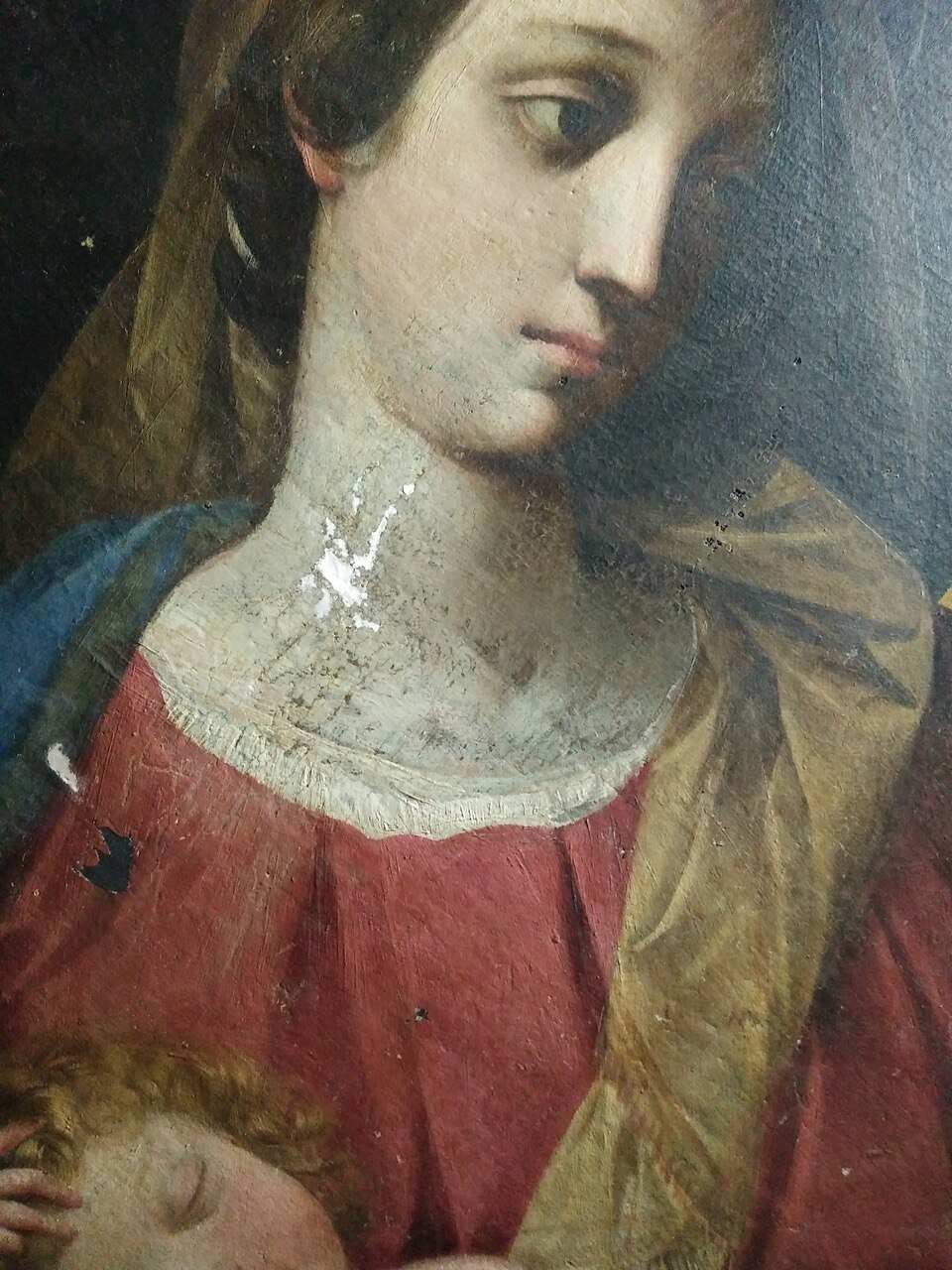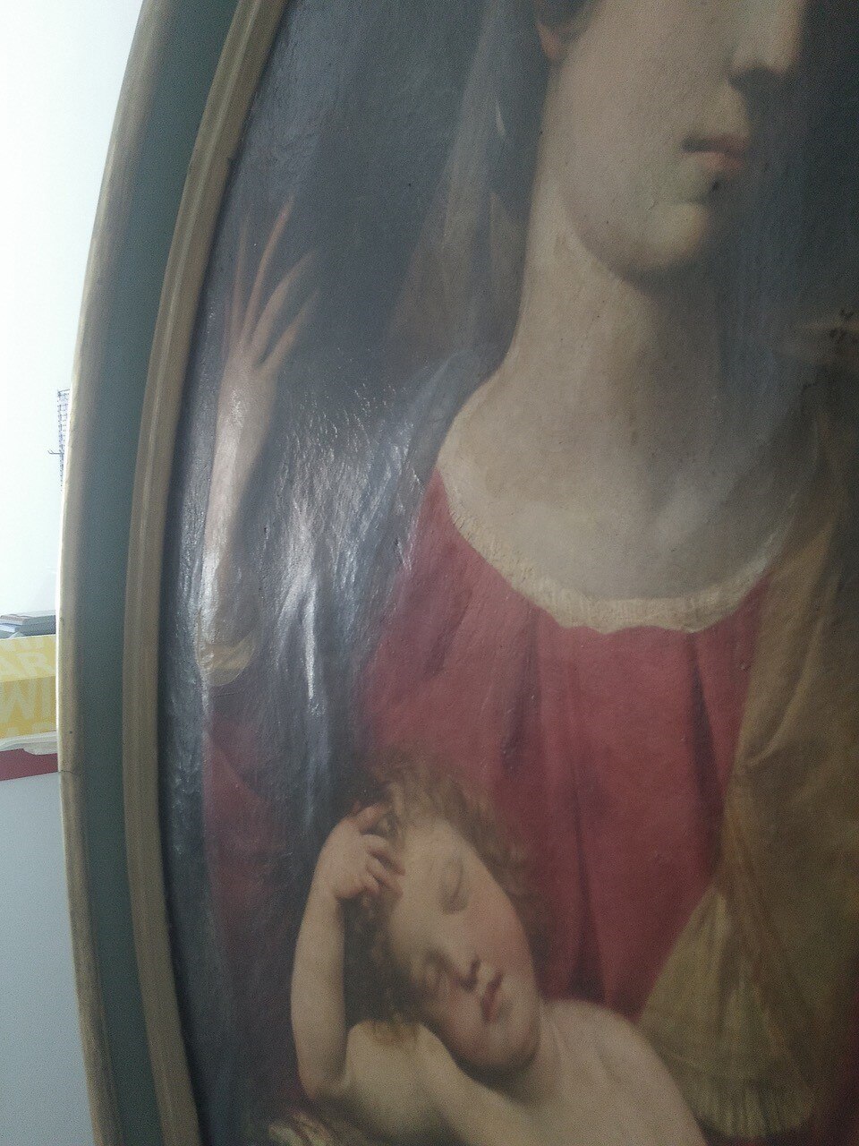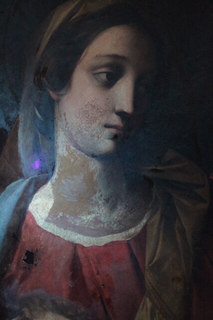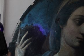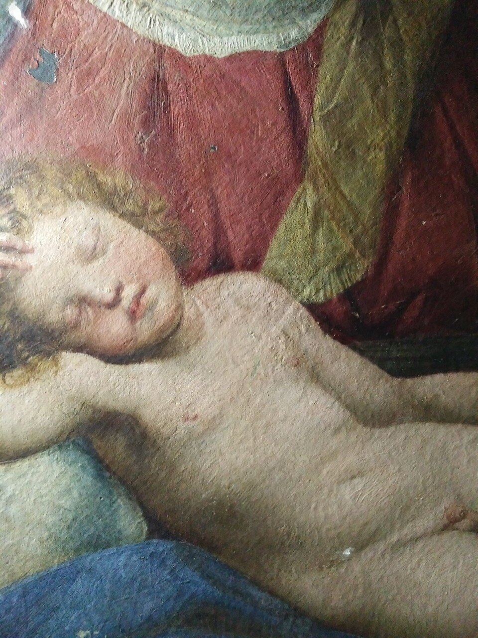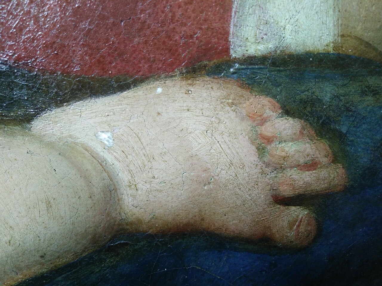 Il restauro al via. Le foto si riferiscono alle attività di studio delle problematiche, a luce radente di un particolare con deformazione della mano della Vergine; a luce visibile di uno con ridipinture (veste San Giuseppe) e di uno con ridipintura (gamba del Bambino), ed infine di un particolare con piccole lacune e ossidazione della vernice. L’intervento viene realizzato dalla restauratrice Sonia Radicchi.