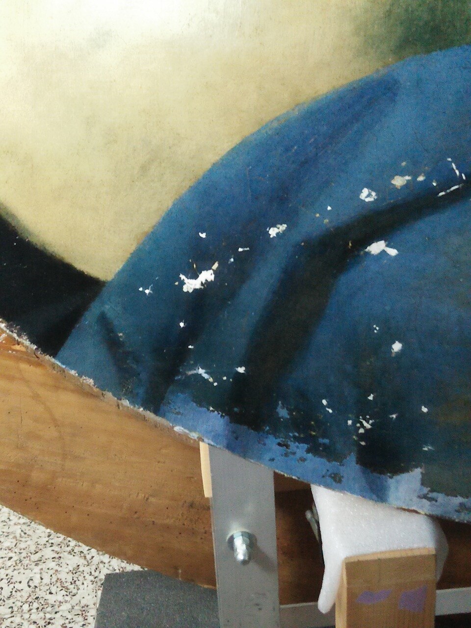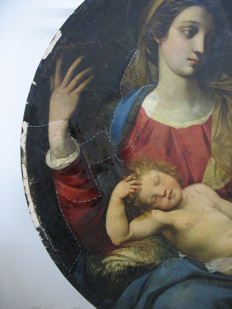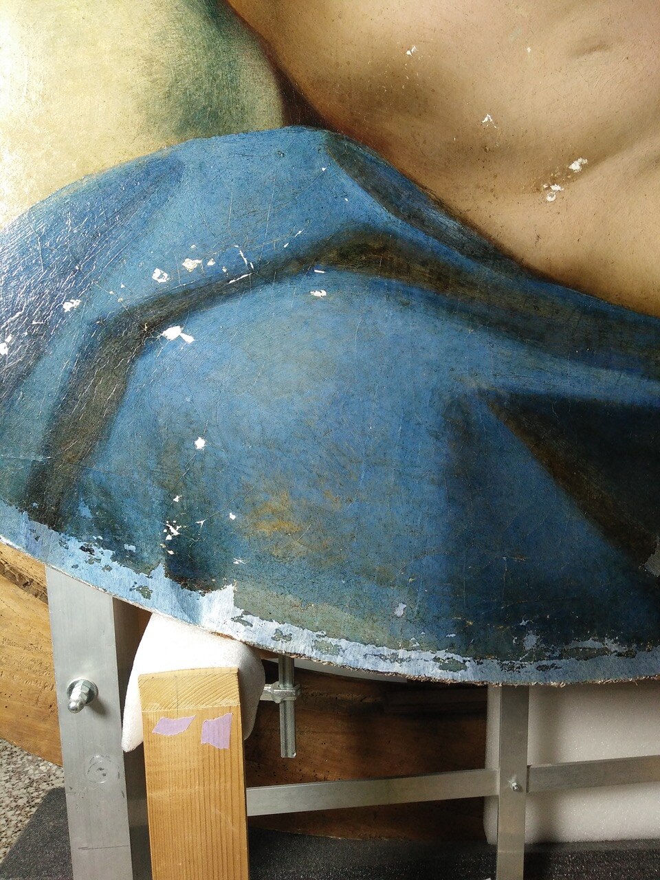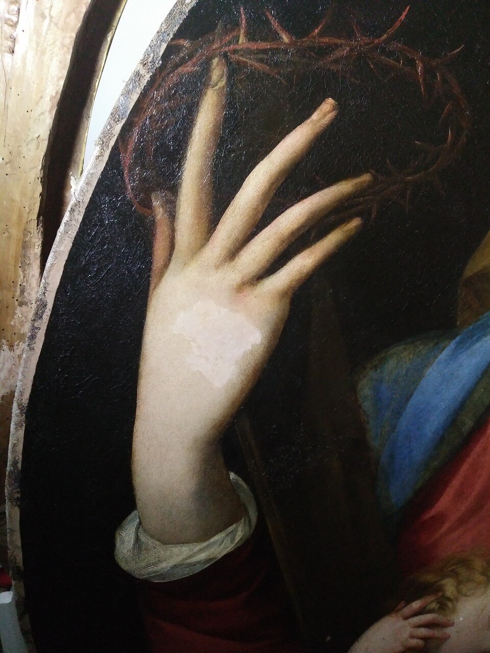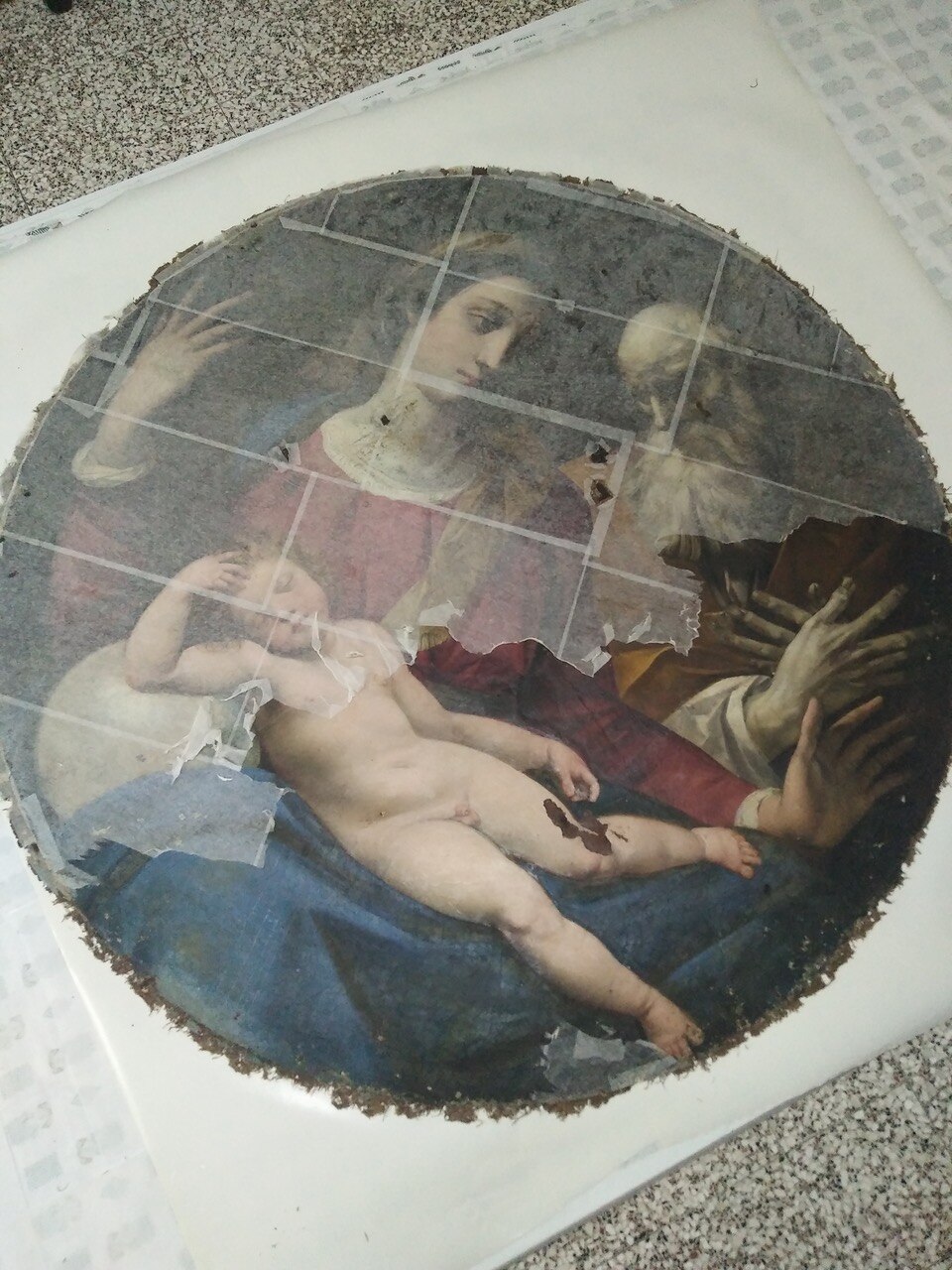 Verso la fine del restauro. Ecco le immagini delle fasi di stuccatura, di foderatura e dei primi punti di ritocco pittorico.