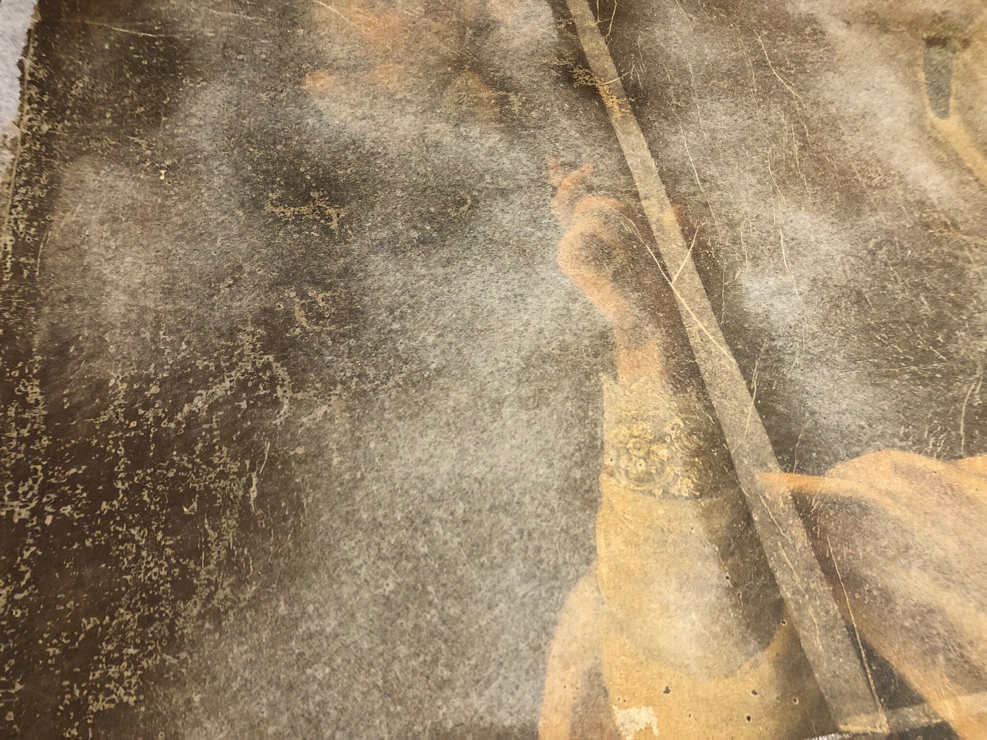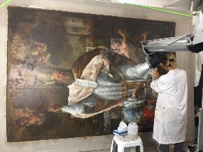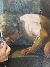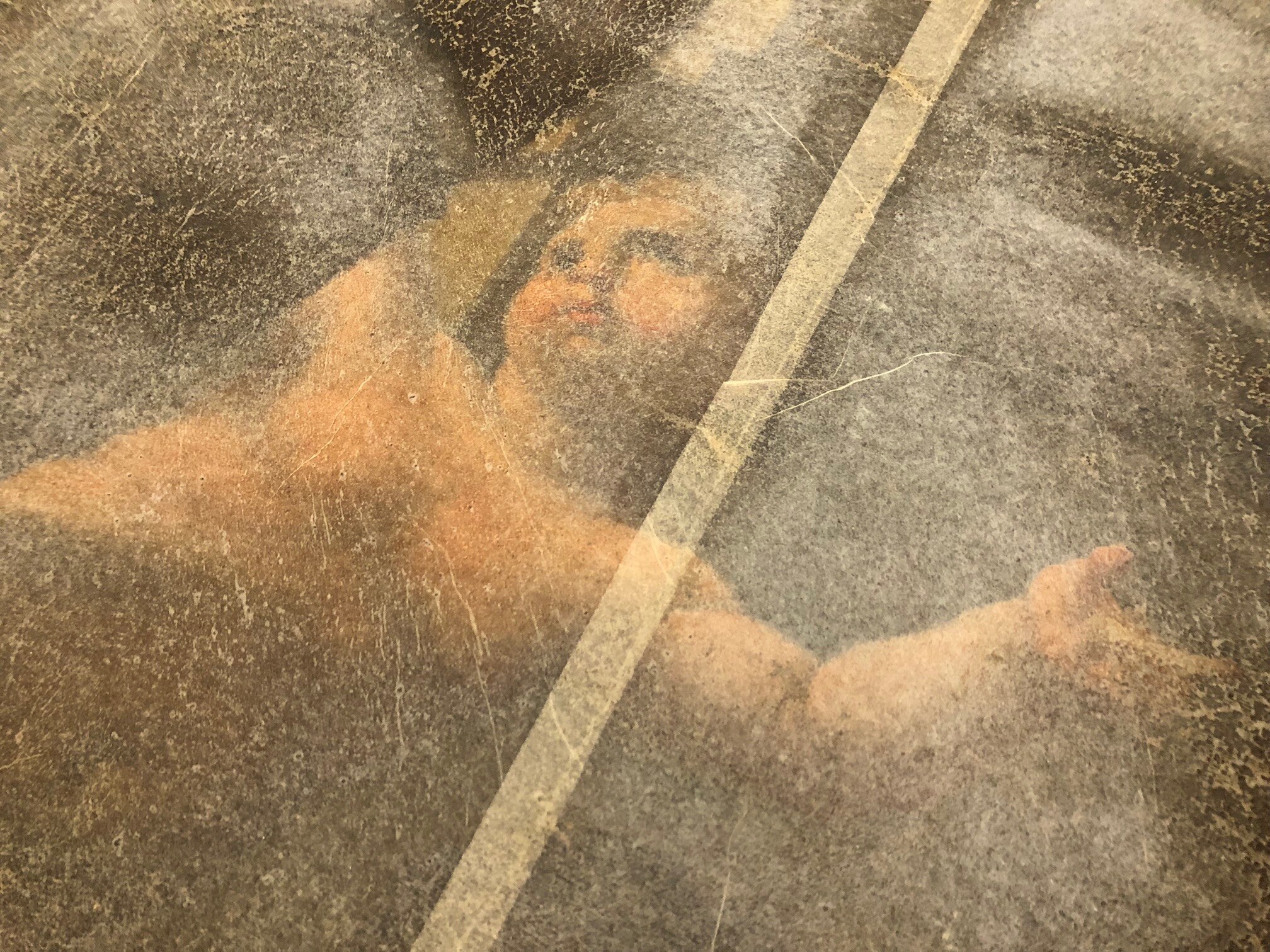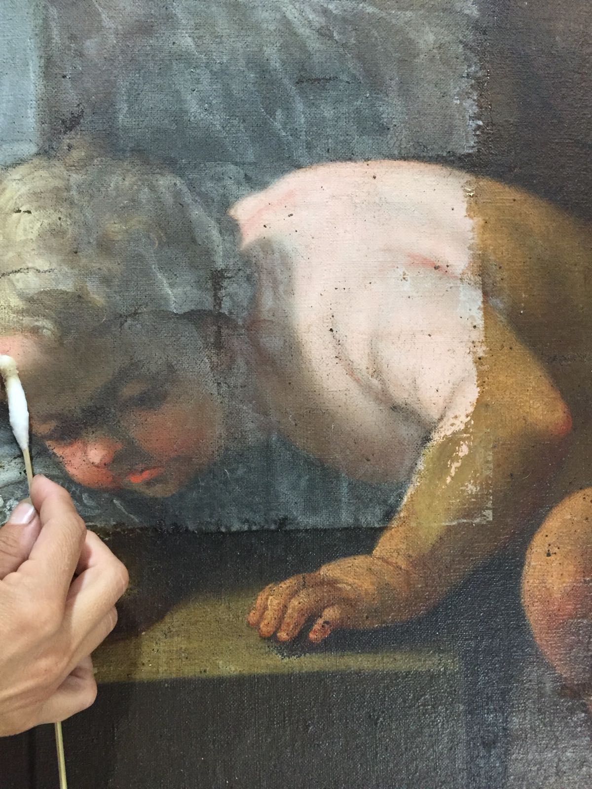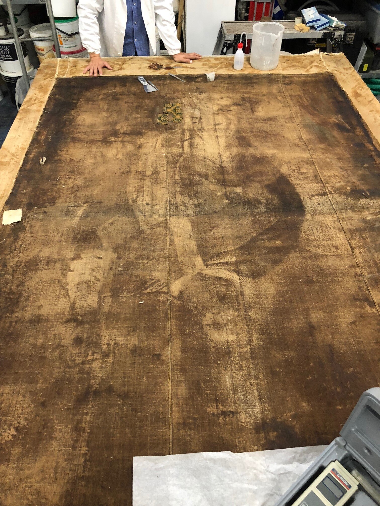 La tela pulita. Arrivati alla conclusione della pulizia della tela, siamo pronti per iniziare la fase di foderatura, il ritocco pittorico e l’applicazione del protettivo finale.