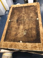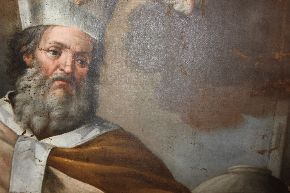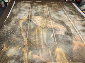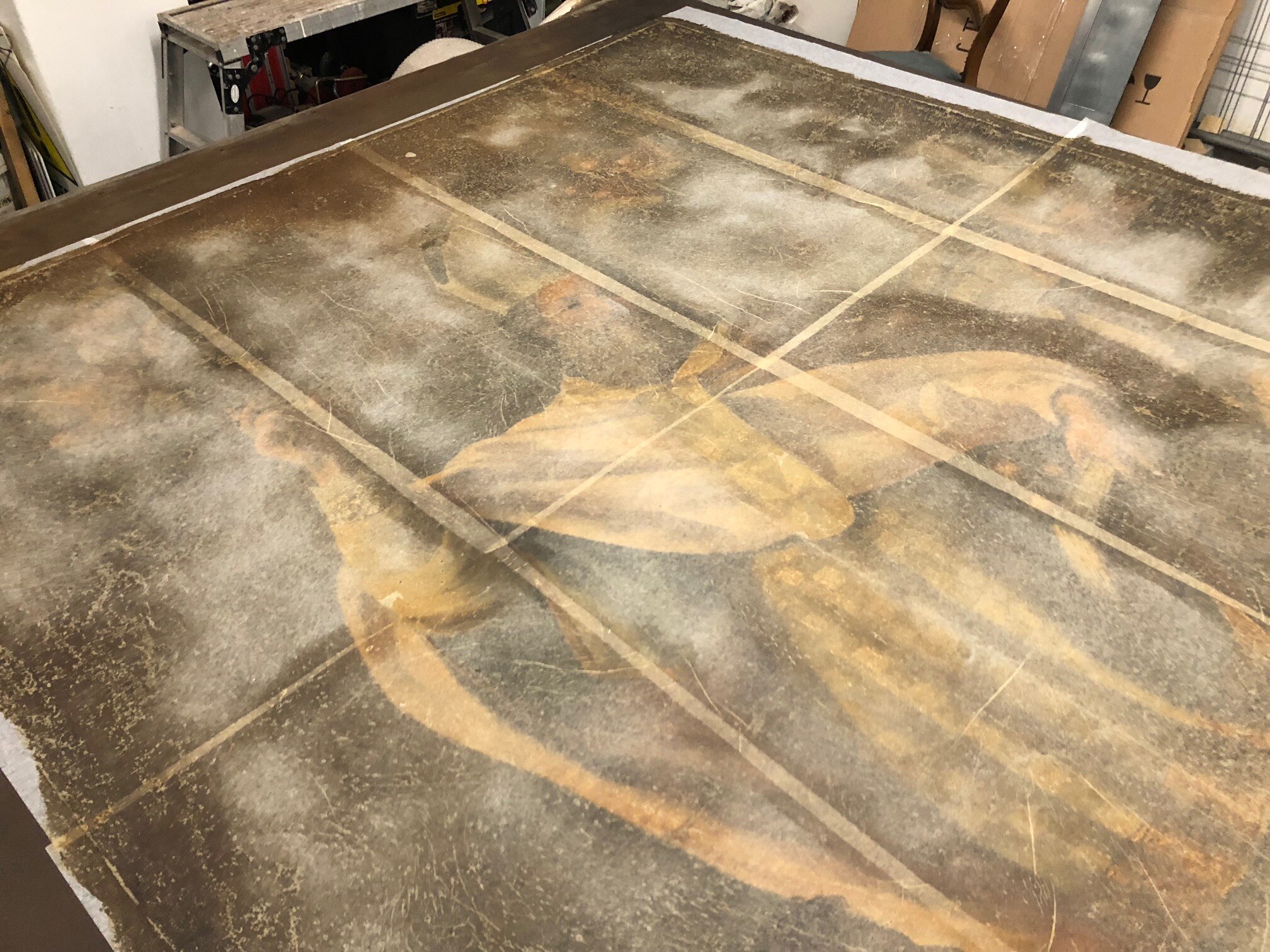 In laboratorio per la foderatura. Ecco le prime immagini della fase di foderatura della tela del Santo: da notare che sul retro è possibile vedere la figura di San Nicola, dato che la tela è estremamente sottile! Da osservarne i particolari, che ora sono oggetto di foderatura con carta giapponese.