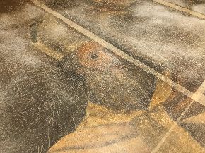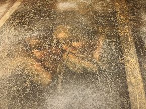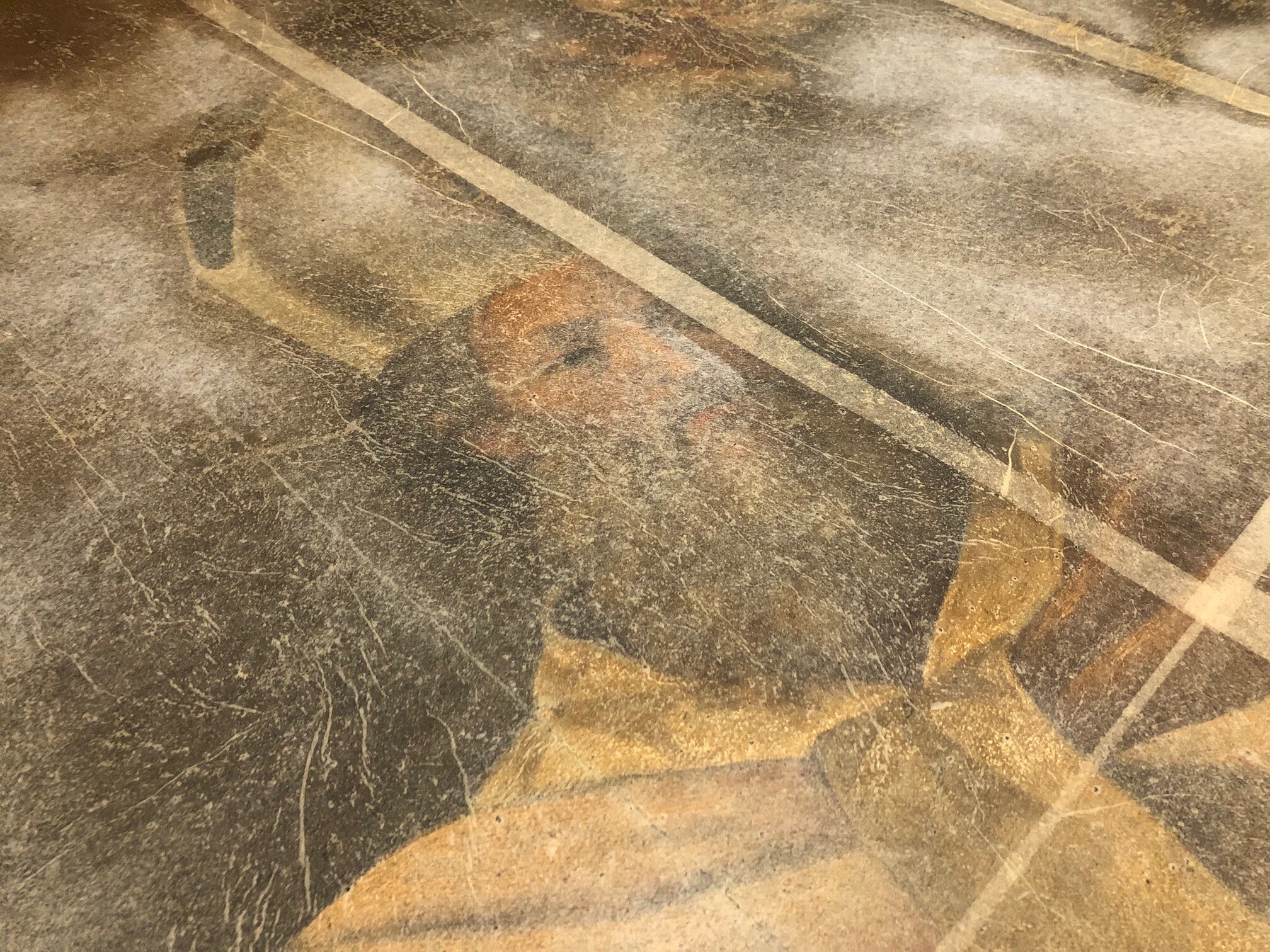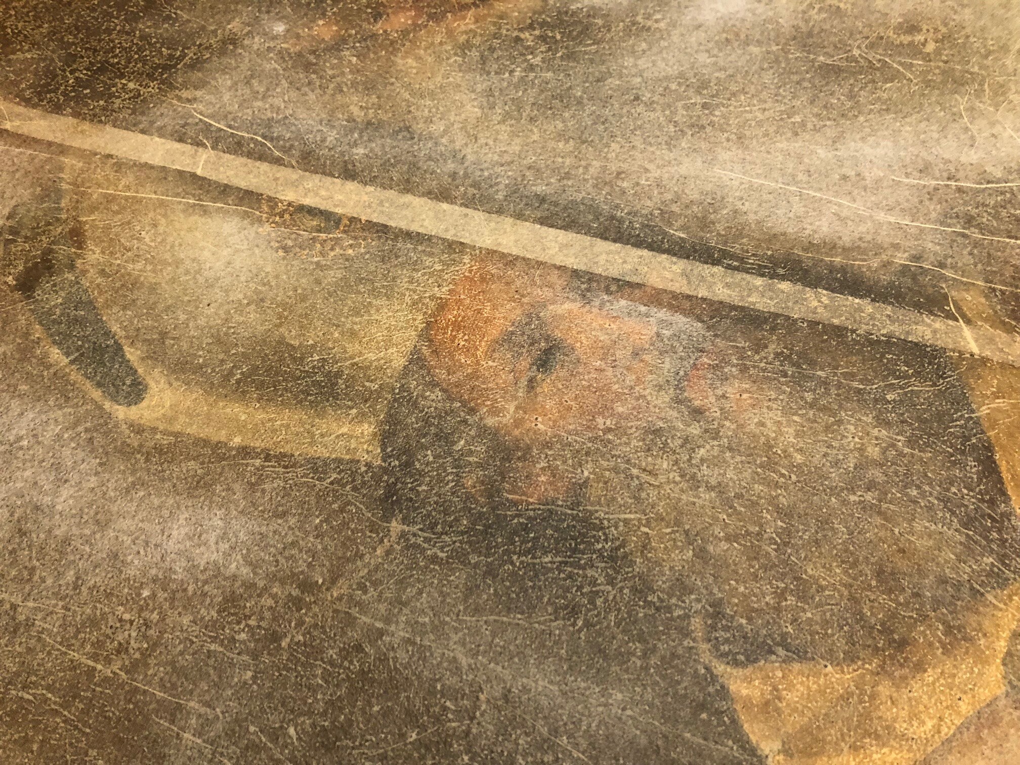La svelinatura e i primi saggi di pulitura. Ecco le immagini di queste delicatissime fasi iniziali, che prevedono prima l'asporto della carta giapponese che serve alla prima fase di pulizia superficiale, e in seguitoi primi saggi di pulitura.