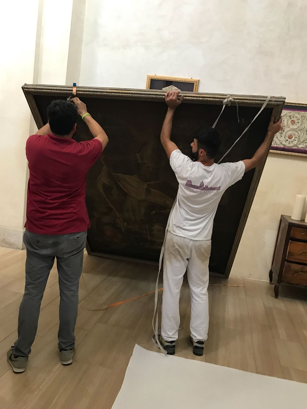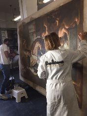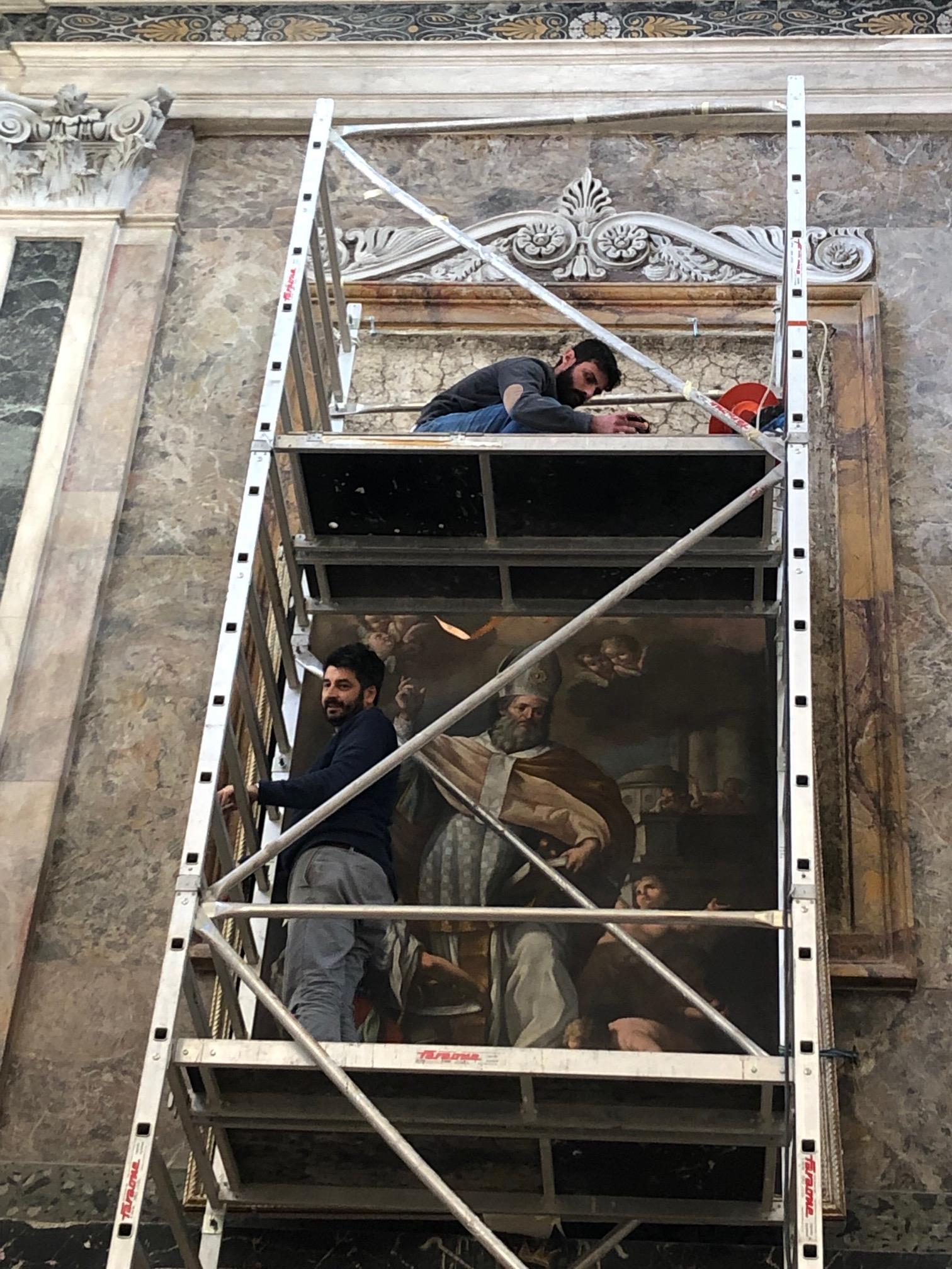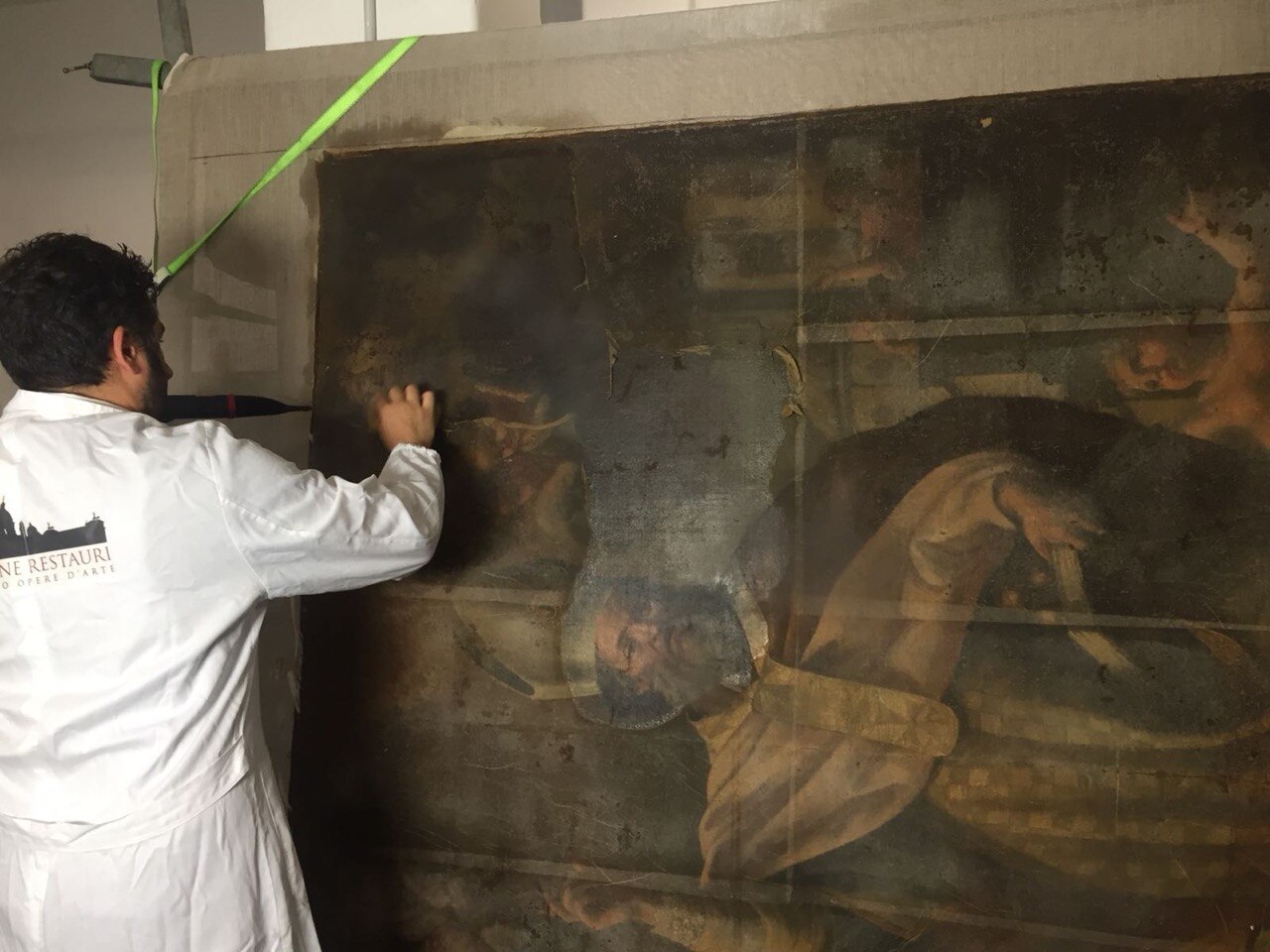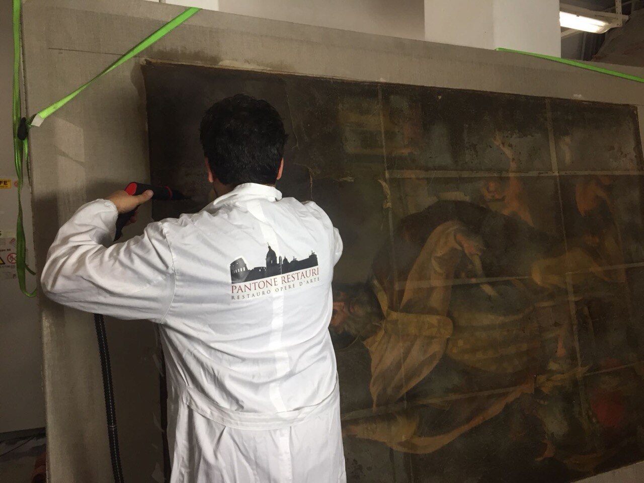 Pronti, si parte! Ecco le prime immagini della tela che viene smontata dal suo supporto nella Chiesa di Andria. Nella gallery, puoi vedere tutti i particolari della pregevole opera, pronta per tornare al suo splendore!