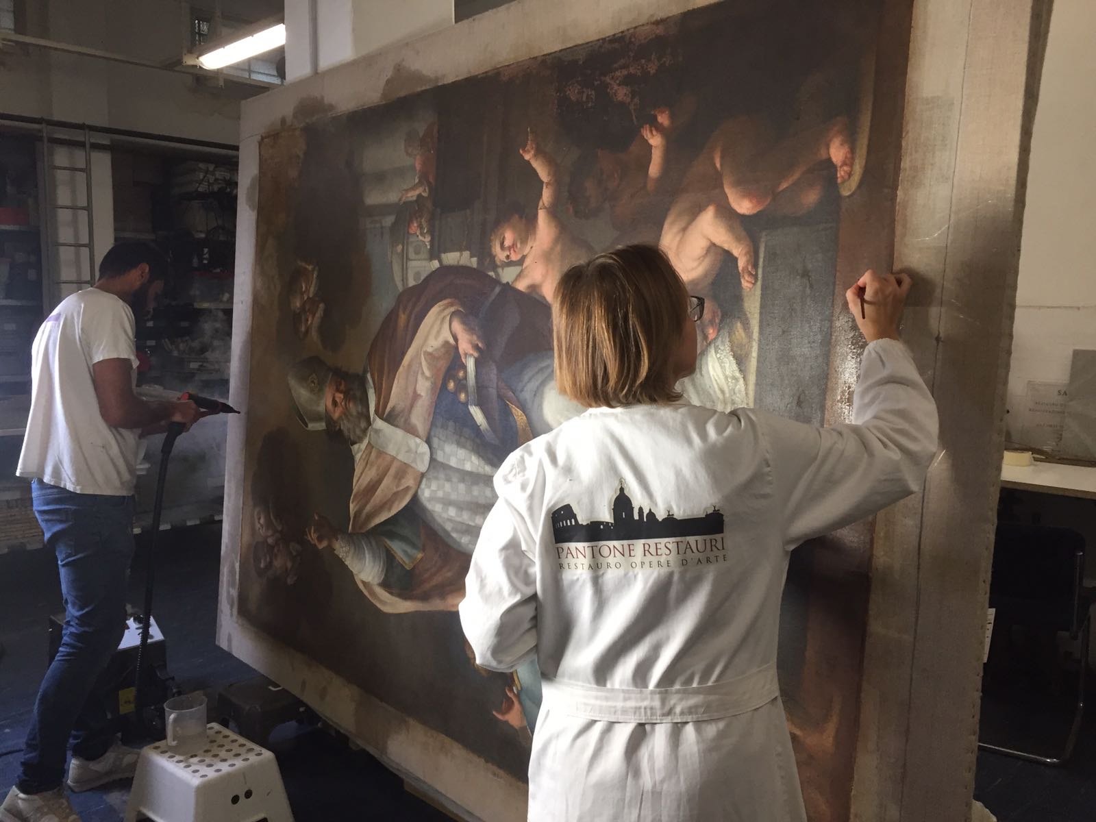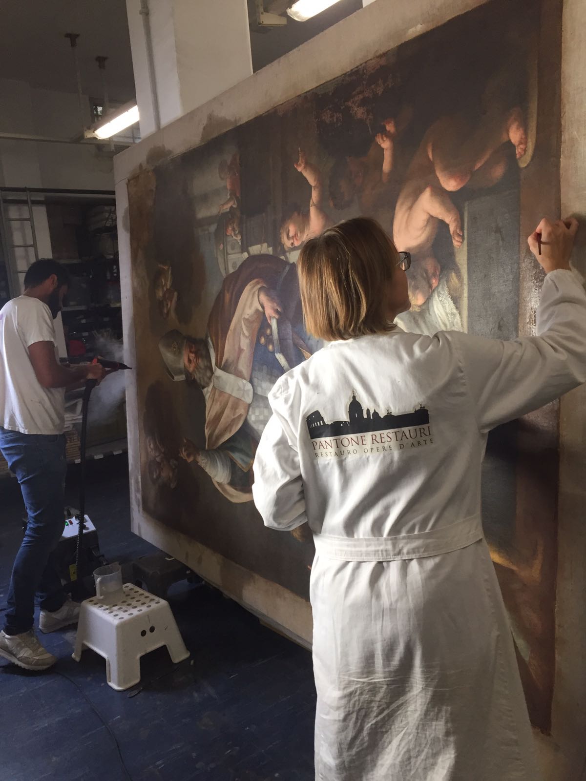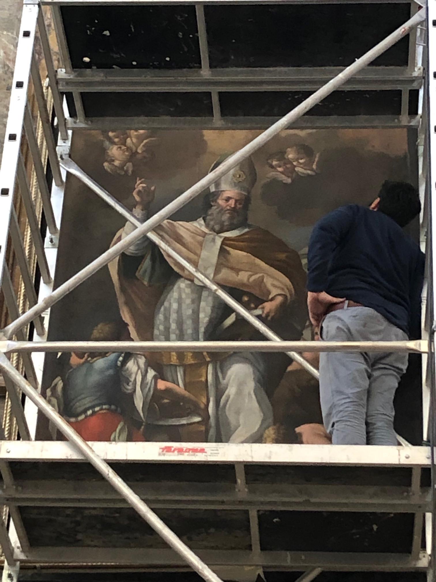 Pulitura e primi ritocchi. Guarda tutti i particolari di questa cruciale fase: la tela del Santo sta riprendendo vita con i suoi meravigliosi colori!