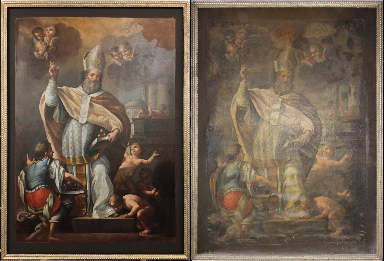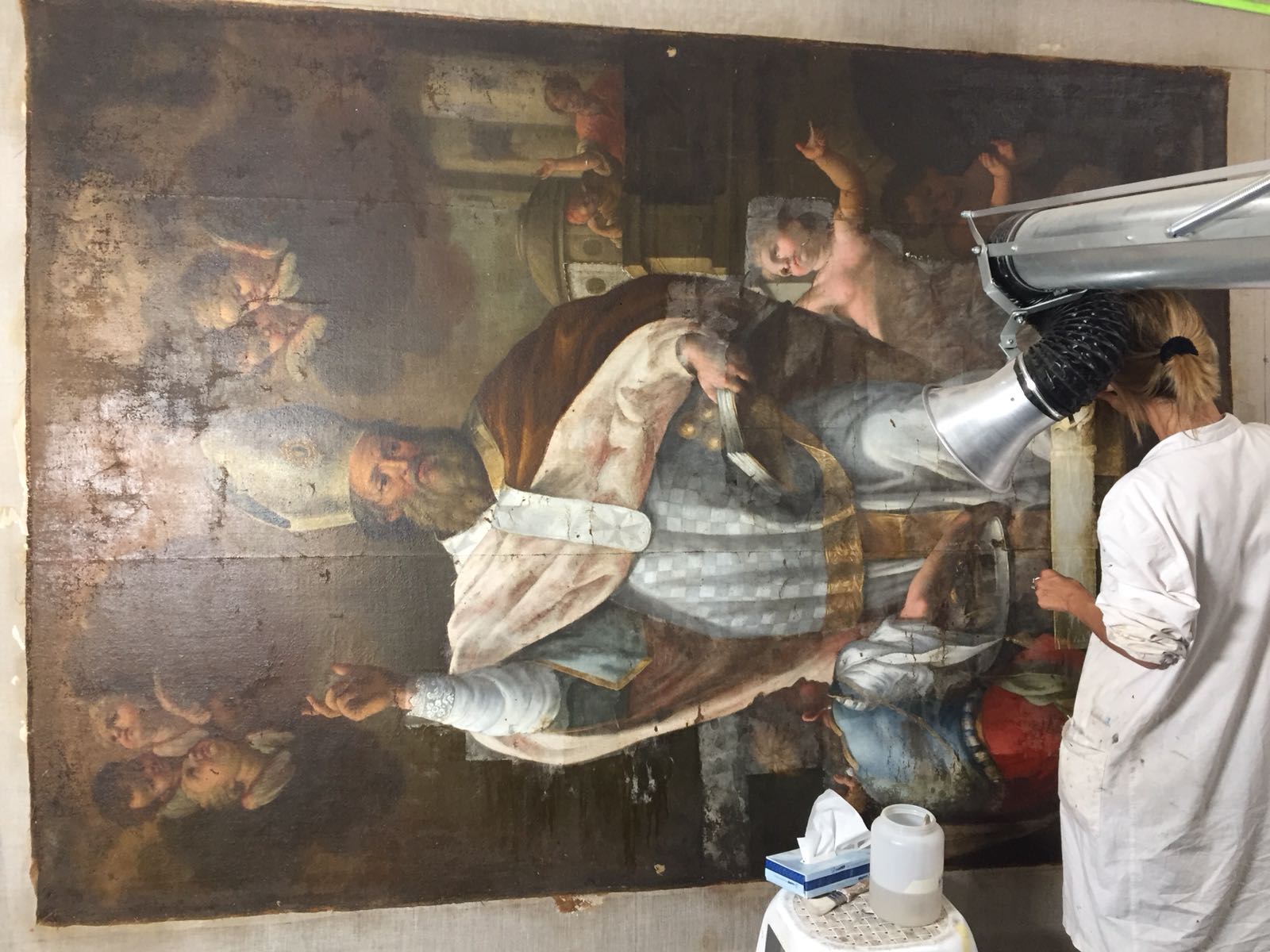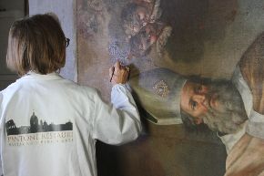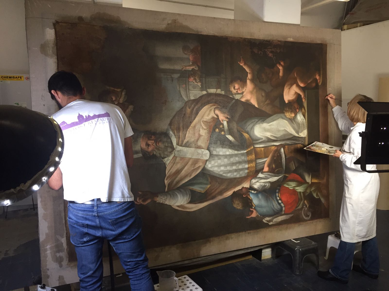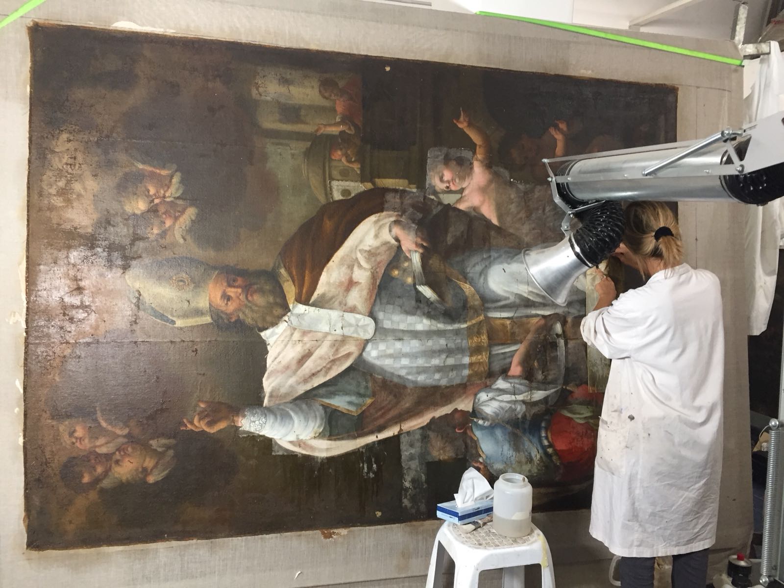 Pulitura e primi ritocchi. Guarda tutti i particolari di questa cruciale fase: la tela del Santo sta riprendendo vita con i suoi meravigliosi colori!