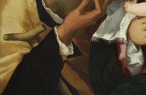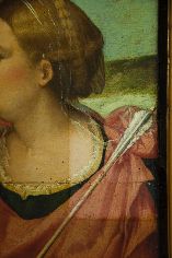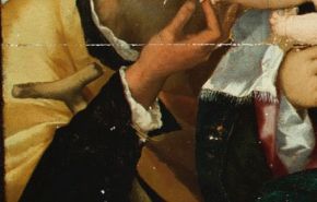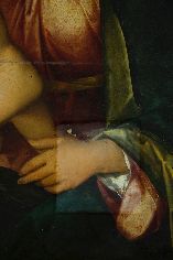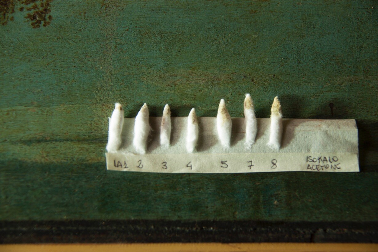 I saggi di pulitura. Sono stati effettuati su alcune parti del quadro i primi saggi di pulitura, che ci consentiranno di valutare le modalità d’intervento complessive.