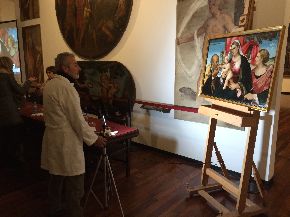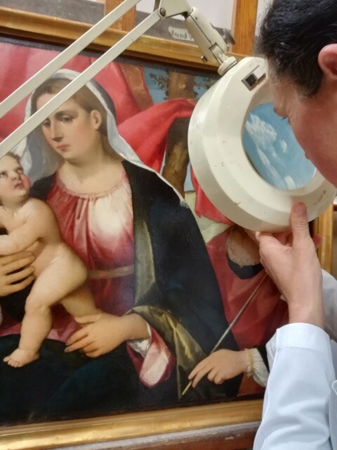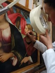 Il restauro procede rapidamente! Come prima operazione, è stato effettuato il controllo del retro della tela, lo stacco della cornice dalla tavola e si è proceduto con il trattamento biocida ma solo in forma preventiva, dal momento in cui non si è riscontrato alcun attacco di insetti xilofagi in atto. A seguire, è stato rimosso il deposito incoerente mediante spolveratura con pennellesse morbide, spugne e panni adeguati, e il consolidamento della pellicola pittorica tramite adesione localizzata dei sollevamenti di colore con adesivo sintetico, con utilizzo del termocauterio per adagiare il colore e far penetrare meglio il prodotto. Dopo il controllo della pellicola pittorica, è stato misurato il ph della tela e sono state preparate le soluzioni acquose tamponate per la rimozione del deposito superficiale coerente. Infine, a seguito del test di solubilità per la rimozione della vernice e della preparazione di miscele solventi da applicare, sono state rimosse le stuccature dei precedenti restauri con tamponi di solvente o acqua tiepida.