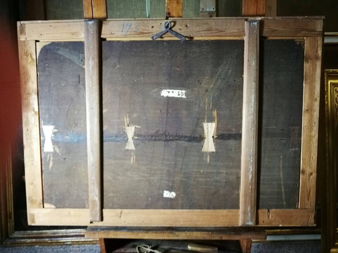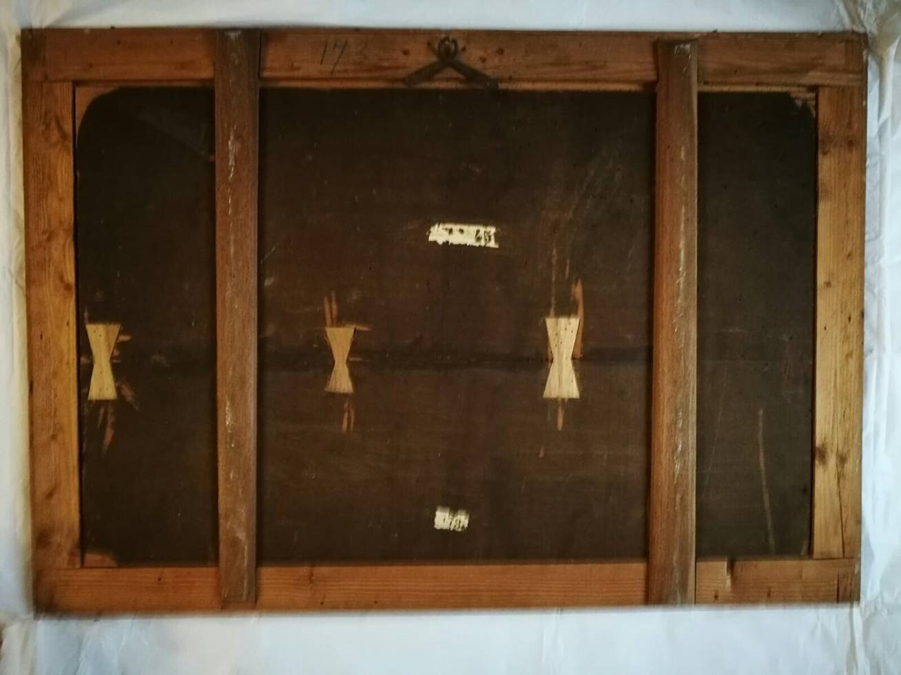 Il supporto ligneo del dipinto, costituito da due tavole giuntate longitudinalmente, ha subito in precedenza interventi strutturali che ne hanno garantito una buona stabilità: i sollevamenti pittorici sul fronte interessavano, tuttavia, soprattutto la linea di commettitura delle tavole, oltre a punti sparsi sull’intera superficie.