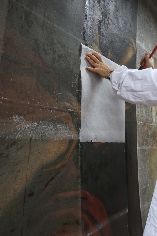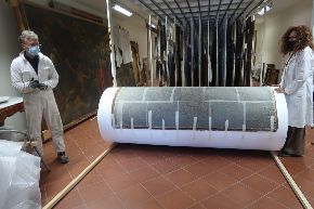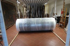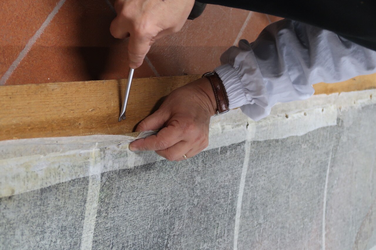 La velinatura e rullatura. Ecco le immagini delle fasi di velinatura e rullatura dell'opera, che è stata trasferita ora in laboratorio.