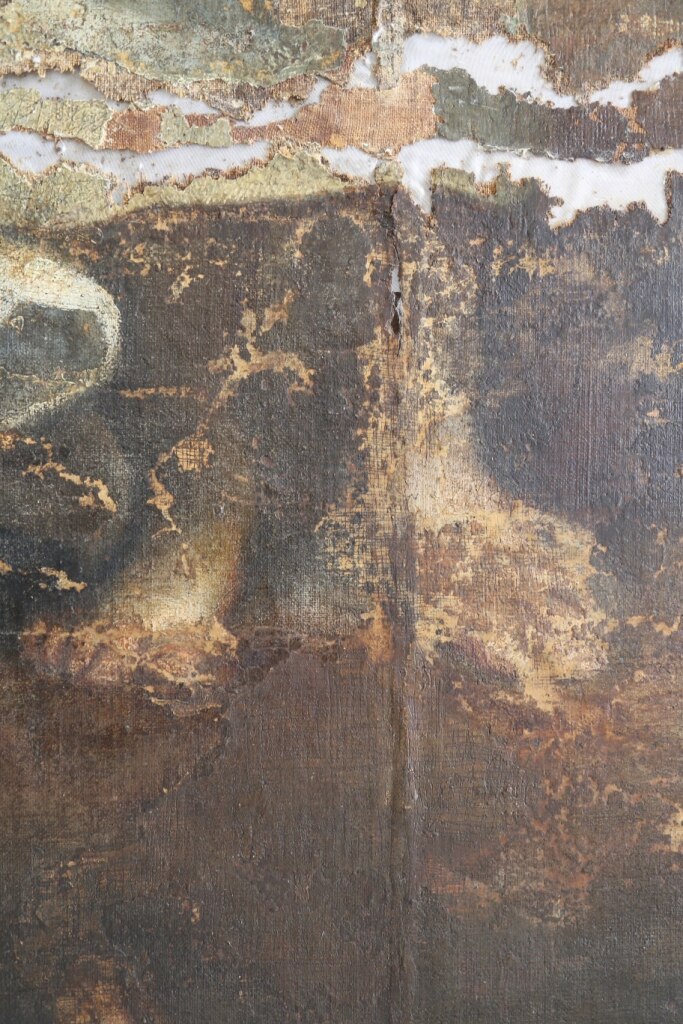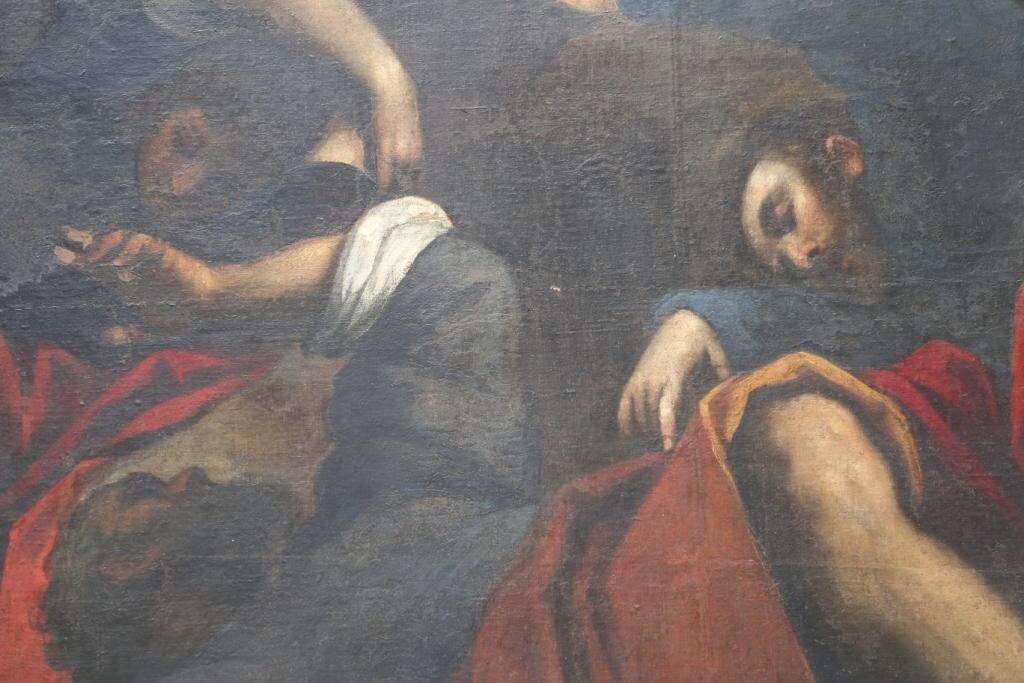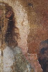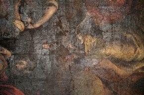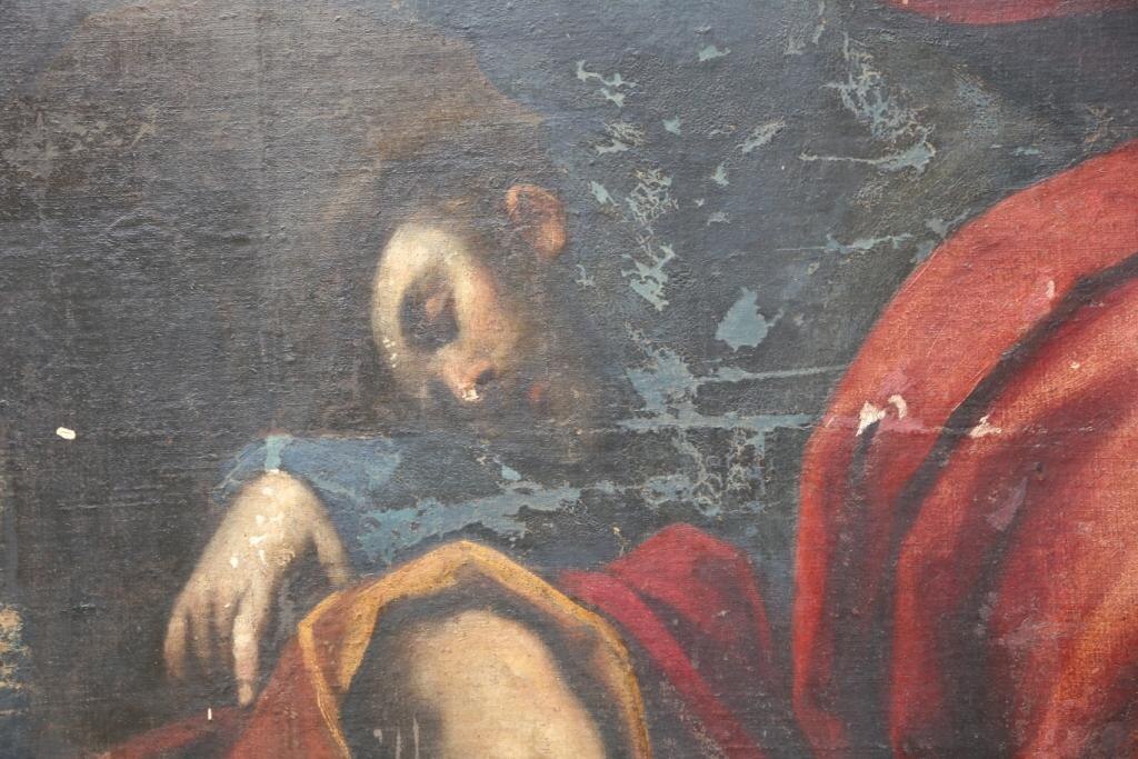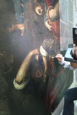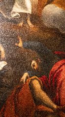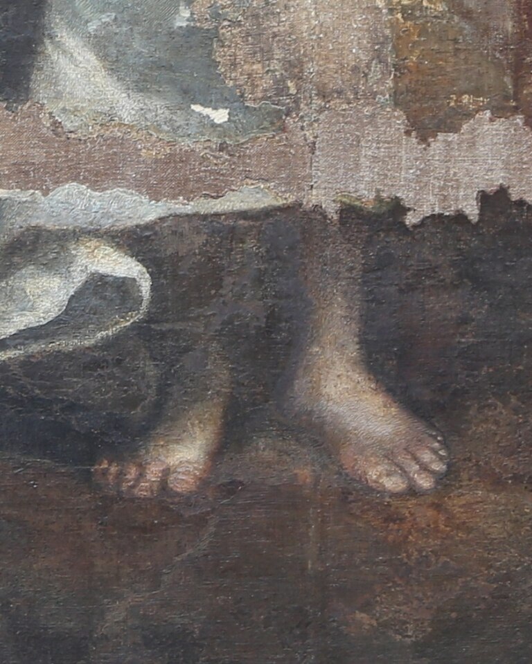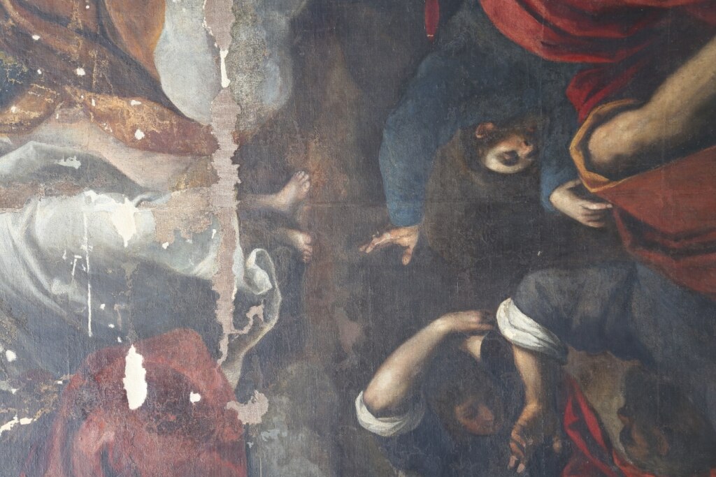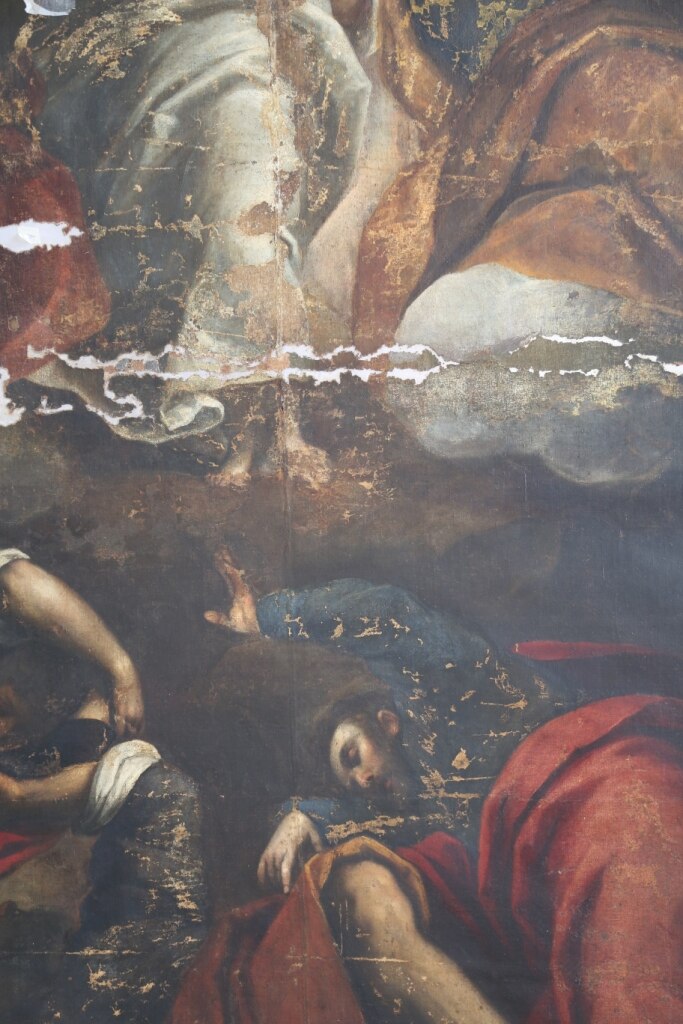 Il ritocco e il reintegro pittorico. Ecco alcune foto che evidenziano il ritocco ed il reintegro pittorico in alcune parti. Si tratta di un restauro veramente molto delicato viste le condizioni critiche dell’opera (basti vedere i cedimenti della tela nelle foto).